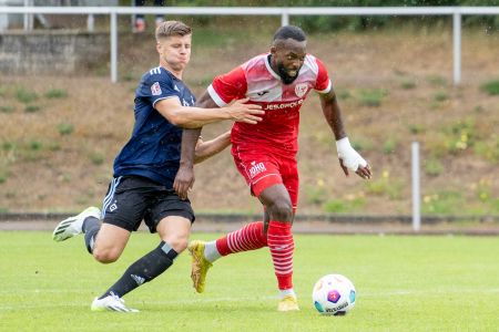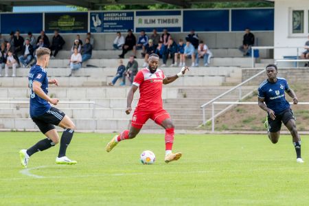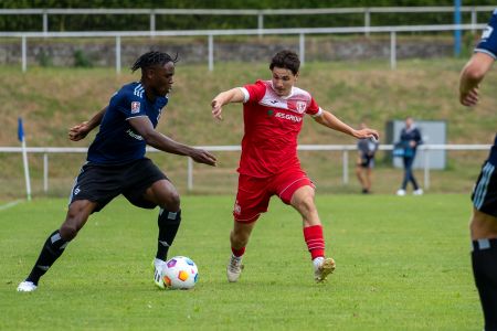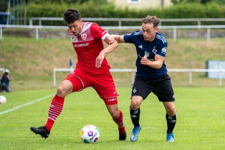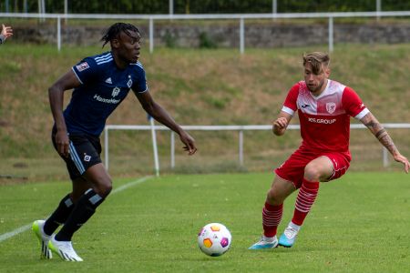 Trainer Lars Fuchs änderte im Gegensatz zum Testkick gegen Schalke nur dreimal. Für David Vogt, Guido Kocer und Fabio Schneider starteten Tom Weilandt, Manassé Eshele und Soufian Benyamina. Unsere Startelf macht in den ersten von dreimal 40 Minuten ordentlich Druck und ging nach zwei Minuten schon in Führung. Soufian Benyamina verwandelte nach Foulspiel an Coskun den folgerichtigen Elfmeter sicher. In den ersten Minuten überrannte unser GFC die Nachwuchskicker vom HSV regelrecht und kam immer wieder gefährlich vor das Tor. Nach einer Viertelstunde fiel dann das 2:0 durch Jannis Farr, der nach Vorarbeit von Elias Kratzer bedient wurde. Vom HSV weiterhin eher weniger zu sehen. Ganz anders als unsere Kicker, die sich förmlich in einen Rausch spielten und vor der ersten Pause den dritten Treffer nachlegten. Benyamina bediente Eshele zum 3:0.