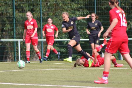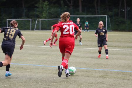 Nach harter Vorbereitung rechneten sich die Mädels auch dieses Mal wieder etwas aus und das Spiel begann auch genau nach den Vorstellungen von Trainer Steven Oklitz. Die erste Halbzeit ging komplett an unseren GFC. Hansa hatte kaum gefährliche Vorstöße und immer wieder tauchten unsere Verbandsligistinnen gefährlich vor dem Hansa Tor auf. Die beste Gelegenheit hatte dabei Mona Ebermann, die nach ihrem Abschluss aber nur die Latte traf. Der unbändige Wille sollte sich aber noch auszahlen. Am Ende einer Dreifach-Chance war es wieder Mona Ebermann, die mit ihrer Flanke dieses Mal Eva Hoppe fand. Die beste Torschützin der Vorbereitung köpfte den Ball nach gut einer halben Stunde zur Führung ein. Leider waren unsere Mädels dann ein Mal nicht ganz aufmerksam und so kam Hansa doch nochmal durch und erzielte nur fünf Minuten später durch Jula Bergner den Ausgleich. Mit 1:1 ging es also in die Pause.