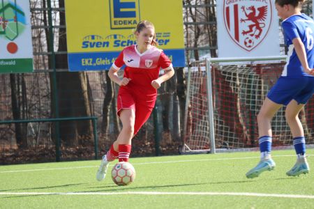 Einen Sahnestart hatten auch unsere U13-Mädchen gegen die Jungs und Mädchen von Traktor Kemnitz in der Kreisliga. Mit dem Anpfiff setzten unsere Kleinsten den Gegner sofort gut unter Druck, sodass Anna-Lena Schumann bereits nach zehn Sekunden die Chance auf das 1:0 hatte. Leider traf sie jedoch den Ball nicht richtig. Im Gegenzug kassierten unsere Mädchen dann zwar das 0:1, ließen sich davon aber nicht verunsichern. Was folgte waren knapp zwanzig Minuten, in denen unsere Mädels ihre bisher beste Saisonleistung abriefen. Nach der zuletzt eher enttäuschenden Hallensaison war das von den Mädchen ein absolutes Zeichen in die richtige Richtung. Sie ließen defensiv kaum etwas zu und falls doch mal ein Schuss die Abwehr durchbrach, war Dunya Hashemi bei ihrem Pflichtspieldebüt als Torhüterin zur Stelle und parierte stark. Aber auch nach vorne zeigten unsere Mädels eine gute Leistung und erspielten sich weitere Chancen über Skadi Zschieschang, die im Mittelfeldzentrum die Fäden zog und eine Wahnsinnsleistung zeigte.