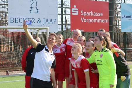 Den Anfang machten unsere B-Mädchen, die direkt mal für ein Feuerwerk sorgten. Gegen die zweite Vertretung des 1. FC Neubrandenburg wollten die Mädels von Sandra Gutmann-Tank direkt mit einem Erfolgserlebnis starten und das gelang ihnen auch in bester Art und Weise. Von Beginn an übernahm das Team das Kommando und erspielte sich Chance um Chance. Ein lupenreiner Hattrick von Lia Bücke brachte unsere B-Mädchen folgerichtig mit 3:0 in Führung. Ob nun im Strafraum einschiebend, nach Ecke von Alena Stechert per Kopf oder mit einer Weitschussrakete in den Knick, es klappte alles. Etwas unnötig daher der Treffer zum 3:1 der Neubrandenburgerinnen. Spannender sollte es aber nicht werden, auch weil Jamie Riebe für die bereits geschlagene Maggy Maaß mit großartigem Einsatz einen Schuss des FCN mit der Brust auf der Linie klärte – Weltklasse.