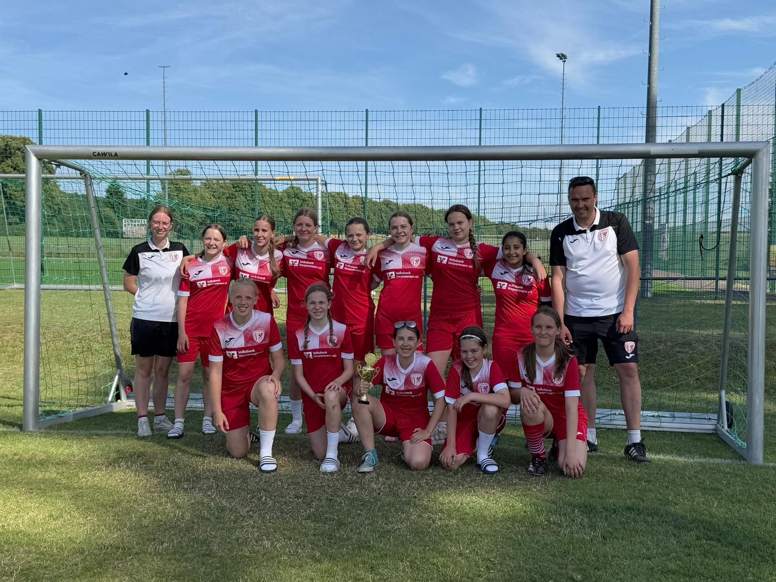 Am darauffolgenden Sonntag wurde es dann schon ernster. „Es war mit Abstand unser längstes und anstrengendes Turnier, was wir in unserer jungen Geschichte gemacht haben“, so Christopher Roß zum Sommerturnier in Lübz. Elf Mädchen-Teams aus ganz Mecklenburg-Vorpommern traten an und spielten im Modus Jeder-gegen-Jeden. Dabei entwickelten sich sehr viele Duelle auf Augenhöhe, die meisten Teilnehmerinnen waren dabei auf einem ähnlichen Niveau. Unsere Mädels starteten mit einem 0:0 gegen eines der beiden Lübzer Teams. Im Nachhinein war dies ein Achtungserfolg, denn dieses Team sollte am Ende den Turniersieg holen und lange Zeit ohne weiteren Punktverlust bleiben. Dabei hatten unsere C-Juniorinnen sogar drei Großchancen, mit etwas Glück geht der Sieg dabei sogar an uns. Die geschlossene Mannschaftsleistung war der große Faktor, der vor allem über die ersten vier Spiele hinweg den Erfolg brachte. Ein 3:0 gegen Dynamo Schwerin, das 0:0 gegen Groß Plasten und ein 1:0-Sieg gegen den Rostocker FC bedeuteten nach vier Spielen den zweiten Platz ohne jeglichen Gegentreffer und das, obwohl gegnerische Spielerinnen teils drei bis vier Jahre älter waren. Dies lag neben der starken Abwehr auch an der überragenden Leistung von Dunya Hashemi im GFC-Tor. Erst gegen Hansa Rostock gab es einen kleinen Rückschlag. Dort war die spielerische Qualität der Gegnerinnen etwas zu hoch, sodass am Ende ein 0:3 auf der Tafel stand.