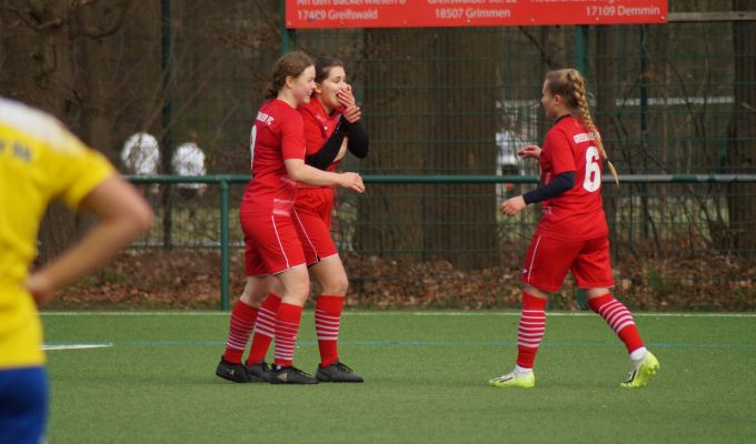 Im Landespokal der B-Junioren lief es für unseren Nachwuchs schon erfolgreicher. Unsere U17 war ebenfalls unter der Woche, am Donnerstag, zu Gast beim FC Rot-Weiß Wolgast. Schnell war klar, dass unsere Jungs dominierten. Bereits in der 13. Minute stand es 3:0, Torschützen Tomass Kmetjuks, Ande-Finjas Müller und Niklas Klüber. Kurz vor dem dritten Treffer dann aber ein massiver Rückschlag: Sowohl Benjamin Wegener als auch sein Gegenspieler verletzten sich so stark, dass sie mit dem RTW abgeholt und ins Krankenhaus gebracht werden mussten. Gute Besserung, Benni! Daraufhin stand das Spiel kurz vor dem Abbruch. Fast eine Stunde dauerte der Rettungseinsatz. Glücklicherweise konnte die Partie dennoch fortgesetzt werden, spielte sich aber fast ausnahmslos in der gegnerischen Hälfte ab. Bis zur Pause fielen noch vier weitere Tore, drei Mal Tomass Kmetjuks, einmal Tom Reimus. Und auch in der zweiten Halbzeit ging es direkt so stark weiter. Zwei Minuten nach Wiederanpfiff erhöhte Jonas Horn auf 8:0. In der 62. Minute konnten die Gastgeber dann noch einen Ehrentreffer erzielen, nichtsdestotrotz war ein deutlicher Klassenunterschied zu sehen, der am Ende den deutlichen 12:1-Sieg unserer Jungs definitiv rechtfertigte. Die Freude über den Einzug in das Pokal-Halbfinale wurde jedoch stark durch die Verletzung getrübt. Wir hoffen, dass du schnell wieder auf dem Platz stehen kannst, Benni!