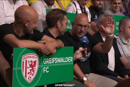 Es war genau 18:38 Uhr, als der ehemalige Bundesliga-Stürmer Nils Petersen die Loskugel an Peter Frymuth übergab. Der DFB-Vizepräsident öffnete die Kugel, lächelte schon etwas und zeigte das Logo vom 1. FC Union Berlin in die Kamera. Das Wahnsinnslos für unseren Greifswalder FC war perfekt! Anschließend wurde unser kaufmännischer Geschäftsführer Daniel Gutmann, der live im Dortmunder Fußballmuseum vor Ort war, noch zum Los befragt. „Sensationell! Nils Petersen, immer noch gut an der Murmel. Wir freuen uns", richtete Gutmann den Daumen hoch und ein Dankeschön Richtung Losfee und fügte an: „Wir sind nicht so weit weg von Berlin und ich gehe davon aus, dass die Hütte voll wird. Es ist von uns kein Wunsch übrig geblieben und ich denke, dass Greifswald gerade Kopf steht. Ich sende Grüße in die Hansestadt und es ist wirklich ein super Los." Hier gibt's die Auslosung nochmal im Re-Live.