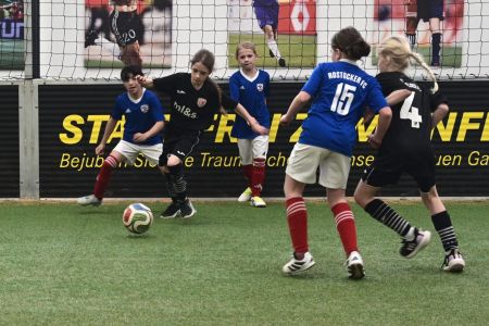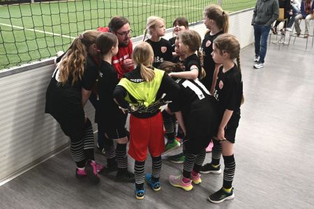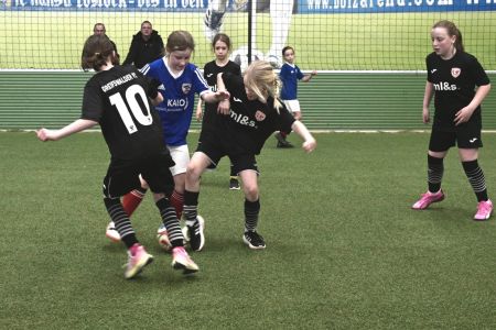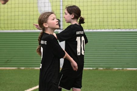 Für unser jüngstes Mädchenteam stand am Wochenende in der Bolzarena im JOHO-Park ein Landesturnier auf dem Programm. Es ging in Hin- und Rückrunde gegen vier andere Teams und unsere GFC-Mädchen wussten zu überzeugen. Trotz spielerisch guter Leistung ging das Auftaktspiel gegen Bambini FA zwar mit 3:5 verloren, danach dominierten unsere Mädels aber. Gegen den Rostocker FC II und den SV Rambin gab es zwei sehr deutliche Siege, bei denen sich viele verschiedene Mädels mit Toren belohnten. „Es ging an dem Tag wie immer nicht um Ergebnisse, sondern mehr darum, wie sie eingefahren wurden. Wir haben Freitag nochmal den Spielaufbau genau trainiert und das haben meine Mädchen super umgesetzt. Wir legten uns die Gegner durch unser Passspiel und die guten Laufwege zurecht und meine Kleinen haben gesehen, wie gut wir uns gerade auch in Sachen ‚Entknüdelung‘ verbessert haben“, so Trainer Tobias Gürtler, der anfügte: „Besonders gefiel mir dabei der Satz von Sophie, dass die Gegner nun unsere Fehler machen. Die Mädels bemerken ihren Fortschritt.“ Zum Abschluss der Hinrunde schlug das Team im spielerisch wohl intensivsten und stärksten Spiel den Rostocker FC I mit 2:0. Dabei arbeiteten alle Spielerinnen super mit und kämpften füreinander. „Das Teamgefühl ist einfach Wahnsinn. Alle haben sich füreinander zerrissen und es gab nicht eine Spielerin, die leistungstechnisch abfiel“, so Gürtler.