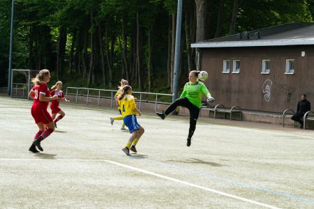 Für unsere U13-Mädels stand am Samstag das vorletzte Spiel der Saison auf dem Plan. Für die Kleinen ging es zu den Jungs des FC Landhagen, wo das Team von Jule Krakow relativ ersatzgeschwächt antrat. Aufgrund von Krankheit, Jugendweihen oder anderen Verpflichtungen fehlte fast die komplette Defensive, sodass viel Disziplin und Durchhaltevermögen notwendig waren. Bei nur einer Wechslerin wurde auch positionstechnisch viel rotiert. Das größte Problem der letzten Wochen war der fehlende Fokus zu Spielbeginn, sodass die erste Halbzeit oftmals wie die Aufwärmphase für die Kleinen wirkte. Dieses Mal fing die Spannung und Konzentration bereits mit der Ansprache in der Kabine an und entsprechend motiviert starteten unsere GFC-Mädels auch in die Partie. Ihr Ziel war es, dass die Jungs nach der Begegnung merkten, dass sie 60 Minuten Fußball gegen uns in den Knochen hatten. Dieser Aufgabe kam das Team zu 100% nach.