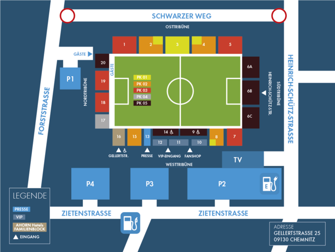 Nach Ihrer Ankunft am Chemnitzer Hauptbahnhof nehmen Sie eine Tram zur Zentralhaltestelle. Sie erreichen das Stadion, indem Sie die Linie 21 in Richtung „Ebersdorf“ bis Haltestelle „Forststraße“ nutzen oder mit der Linie 51/E51 in Richtung „Yorkgebiet/Zeisigwald“ bis zur Haltestelle „Stadion Gellertstraße“ fahren.