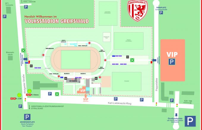 Fans in den Heimbereichen erhalten NUR über den Eingang an der Pappelallee Zugang zum Volksstadion. Der Eingang der Gäste befindet sich wie gewöhnt an der Wolgaster Straße. Für VIPs und Pressevertreter befindet sich der Einlass neben dem Haupteingang des Stadions am Karl-Liebknecht-Ring.