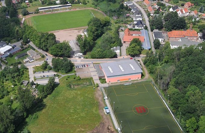 Geradeaus am Imbiss Soltow vorbei bis zur Hauptstraße. Dort rechts, nach ca. 50m links (Stadion ist dort ausgeschildert). Es sind dann noch ca. 200m bis zum Stadion.