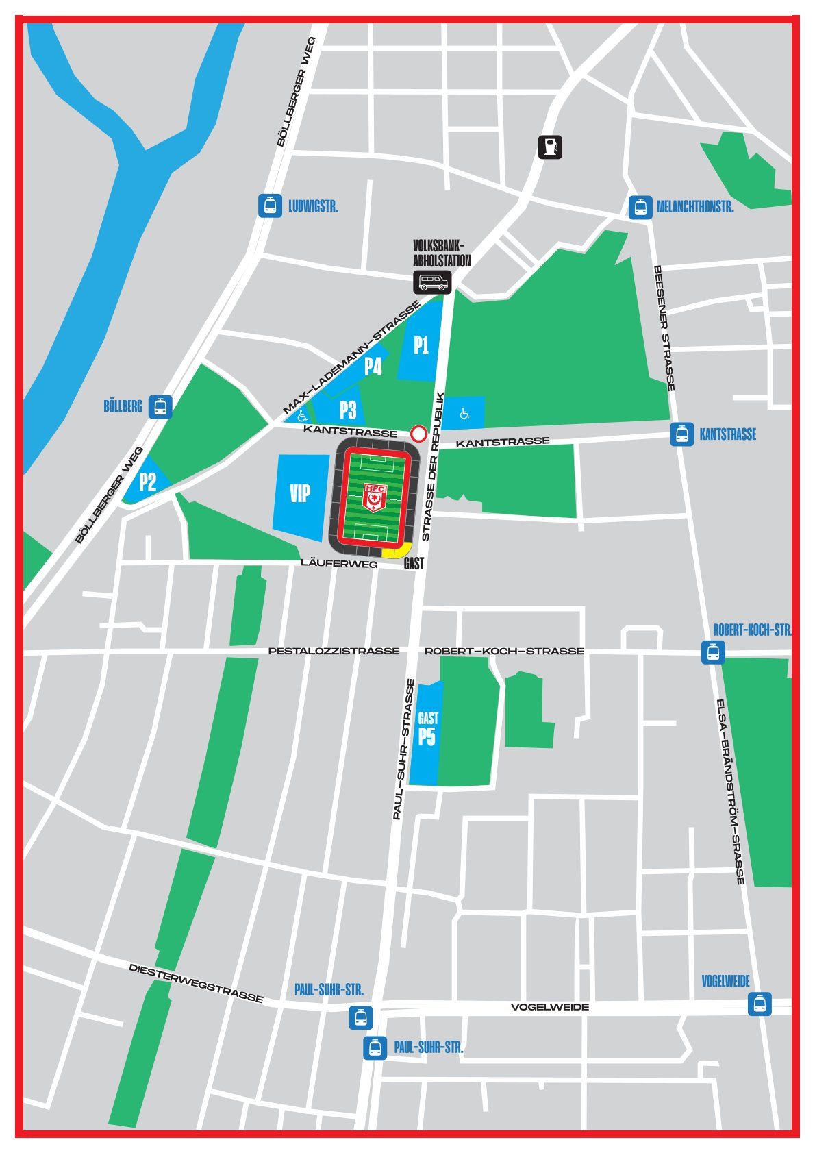 Der Gästeparkplatz befindet sich parallel zur Paul-Suhr-Straße, zwischen Manfred-Stern-Straße und der Robert Koch Straße. Die Parkgebühren betragen 5€. Bitte nutzt diesen Parkplatz, er ist abgesichert und es sind nur 200m Fußweg zum Gästeblock!