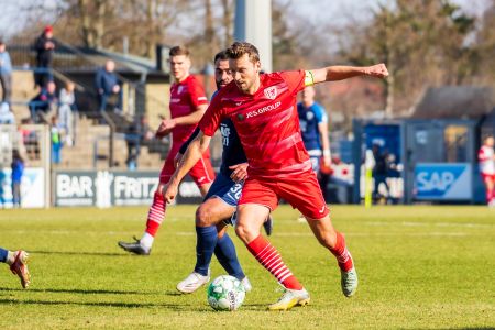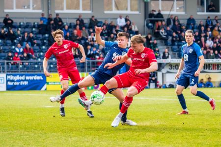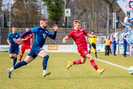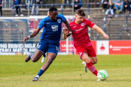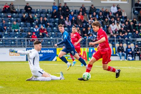 Der Start in die Partie sollte für unsere Kicker gar nicht so gut laufen. Die Babelsberger drückten unser Team immer wieder hinten rein und gingen nach zehn Minuten durch Rudolf Ndualu in Führung. Steinborn setzte sich auf der linken Seite durch, spielte den Ball flach in die Mitte, wo Ndualu ohne Probleme einschieben konnte. Joe-Joe Richardson hatte zwei Minuten nach dem 1:0 die schnelle Antwort parat, doch ein Abwehrbein verhinderte den Ausgleichstreffer. Unsere Jungs mussten diesen Rückstand trotzdem erstmal verdauen und kamen erst nach 20 Minuten ins Spiel. Dann wurden Zweikämpfe gewonnen und es gab auch mal ein paar Passpassagen. Der Ausgleich sollte dann auch noch fallen. Kurz vor der Pause flankte Jannis Farr den Ball in die Mitte. Theo Martens verlängerte auf Fabio Schneider, der den Ball mit einem trockenen Flachschuss im Tor unterbrachte.