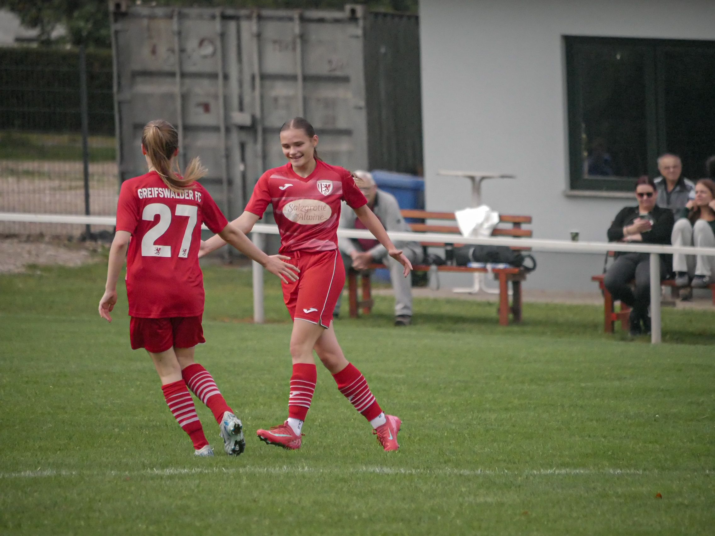 Es war nochmal ein kleiner Mischmasch an diesem Sonntag. Mit gleich zwei Teams starten unsere Frauen in dieser Saison in der Kreisoberliga und zum letzten Mal ging es noch in ein gemeinsames Testspiel. Gegner war das Frauenteam des SV Pastow. Schon von Beginn an zeigte unser Greifswalder FC hierbei eine sehr gute Leistung und dominierte die erste halbe Stunde bereits nach Belieben, ohne sich jedoch zu belohnen. Dennoch zeigte sich das Trainerteam um Amira Haftendorn und Fabian Stei sehr zufrieden, weil die Mädels genau die Vorgaben umsetzten, die mit auf den Platz gegeben wurden. Flache Spieleröffnung beim Abstoß, hohes Pressing, viele Bälle klatschen lassen und das Spiel auch mal beruhigen und nicht immer direkt den Weg nach vorne suchen – all das klappte wunderbar. Nach knapp einer halben Stunde brachte Isabelle Kilimnik das Team dann auch folgerichtig in Führung. In der Pause wollten die Trainer dann nochmal etwas mehr Mut und Entschlossenheit sehen und bekamen dies mit dem Wiederanpfiff geboten. Ricarda Mumm erhöhte mit einem Doppelschlag auf 3:0. In der Folge ließ unser GFC aber nicht nach und drückte weiter. So belohnten sich auch Luke Stahnke, Rike Hoefs und Janka Holtz noch für ihre vielen gemachten Meter mit jeweils einem Treffer. Es war ein auch in dieser Höhe verdienter 6:0-Auswärtssieg für das Team, das nun endgültig auch in die getrennten Mannschaften gehen wird. Unsere Zweite wird entsprechend am kommenden Wochenende in Richtenberg testen, unsere Dritte trifft im Volksstadion auf die Erste. Am 17. September gibt es zum Saisonauftakt dann das direkte Aufeinandertreffen zum Saisonstart in die Kreisoberliga.