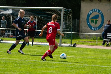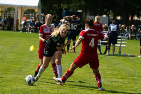 Bereits zum zweiten Mal ging es am vergangenen Wochenende für unsere GFC-Frauen zum Peuler Deerns Cup, einem recht stark besetzten Turnier auf Poel. Es ist ein sehr beliebtes Event und natürlich wollte unser Team dort einen guten Eindruck hinterlassen. Leider lief es zu Beginn etwas holprig. Direkt im ersten Gruppenspiel traf die Mannschaft von Amira Haftendorn auf die späteren Sieger von Hannover 96, denen an diesem Wochenende anscheinend generell einfach alles gelingen sollte. „Hannover hatte schon ein Trainingslager hinter sich und war schon deutlich eingespielter als wir“, bilanzierte Haftendorn und wusste dies auch einzuordnen: „Dieses erste Turnierspiel lief für mich so ein bisschen außerhalb der Wertung. Wir wurden da schon sehr überrannt.“