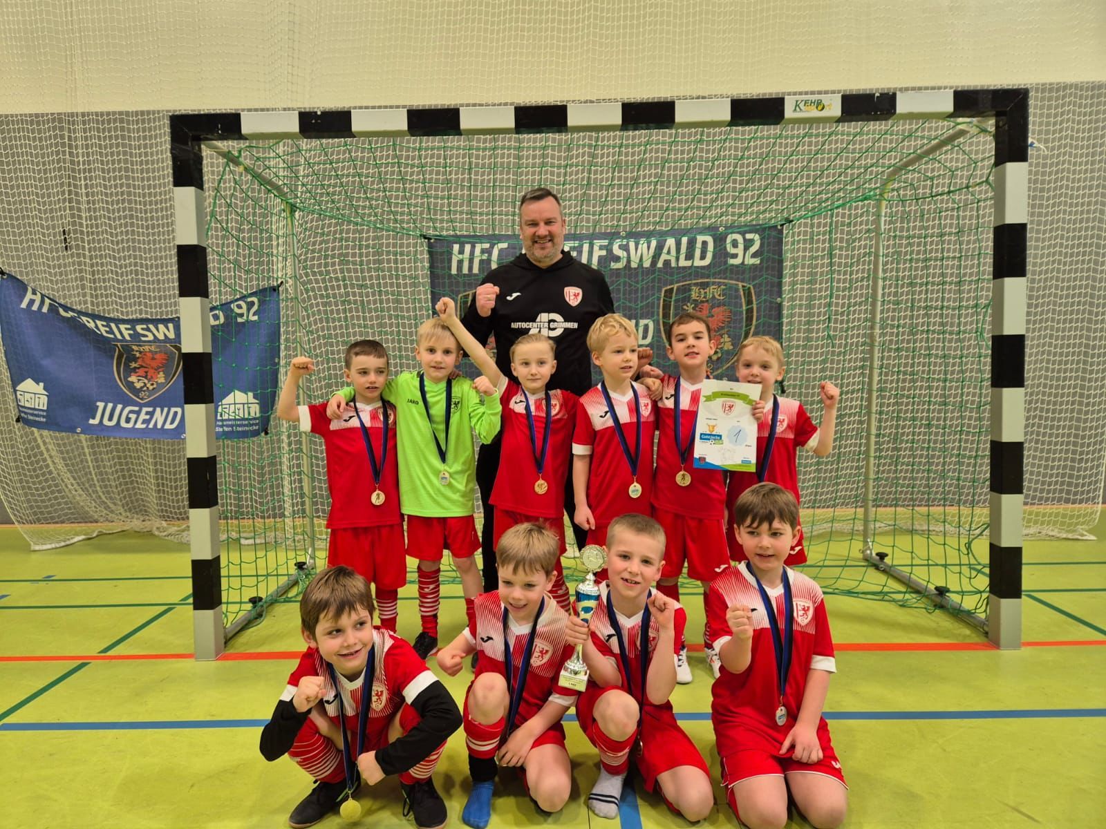 Auch unsere U8 zeigte eine starke Leistung. Das Team von Kristaps Freimanis und Sebastian Liebenow war zu Gast beim 2. Car Color Center Brandenburg Cup der SG Reinkenhagen und konnte nach den bisherigen zweiten und dritten Plätzen nun auch endlich den ersten Turniersieg feiern! Insbesondere die mannschaftliche Geschlossenheit war hierfür ausschlaggebend, doch auch spielerisch sah das in den Eins-gegen-Eins-Situationen schon sehr gut aus. Gespielt wurde ungewohnt für die Jungs mit fünf Spielern auf dem Feld, doch das brachte die Mannschaft überhaupt nicht aus dem Konzept. Gegen die sechs anderen Teams zeigten sie sich sehr stark und gewannen am Ende verdient. Mit Fritz Liebenow stellte die Mannschaft auch noch den besten Spieler des Turnieres. Weiter so!