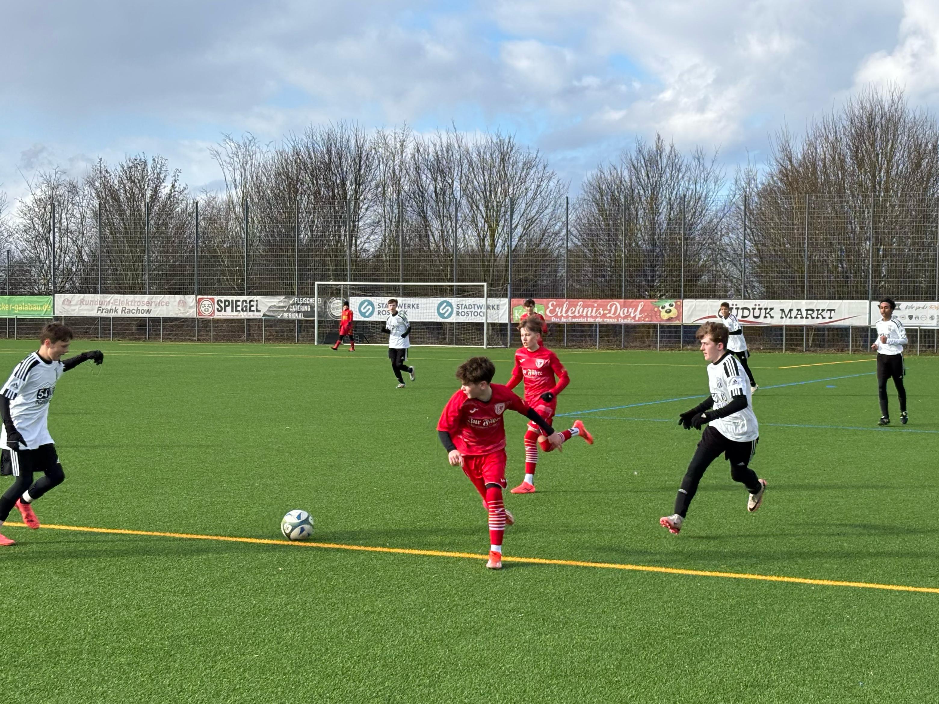 Auch draußen geht es allmählich wieder los. Nachdem unsere U15 vergangene Woche am Dienstag bereits mit 2:0 gegen die gleichaltrigen Jungs von Hansa Rostock gewann, legte auch die U14 draußen wieder los. Die Truppe von John-Philipp Bruhns machte sich auf den Weg zum FSV Bentwisch, die in der Landesliga bisher ungeschlagen durch die Liga marschiert. Gespielt wurde über drei Mal 25 Minuten, in denen unser Team so gut wie fehlerlos im Spielaufbau war und den Gegner sehr gut laufen ließ. Im ersten Drittel gelangen unseren Jungs direkt durch zwei Druckmomente die beiden Treffer zur 2:0-Führung. Danach reagierte Bentwisch auf unser Spiel und stellte sich cleverer an, unterband die Angriffe nun etwas früher. Körperlich war unser GFC zwar etwas unterlegen, ließ aber auch kaum noch etwas zu und so blieb es am Ende auch bei unserem anderen C-Juniorenteam beim 2:0-Erfolg. Sauber, Jungs!