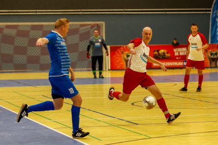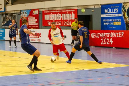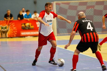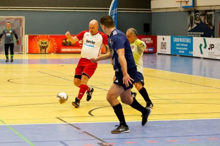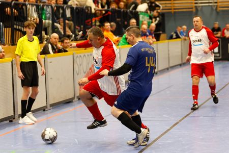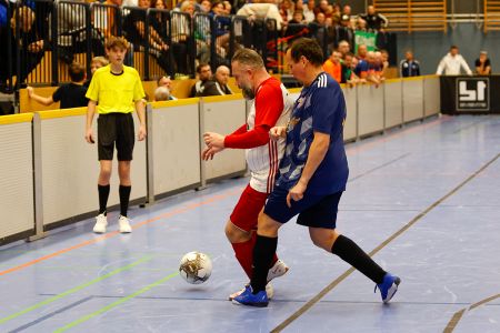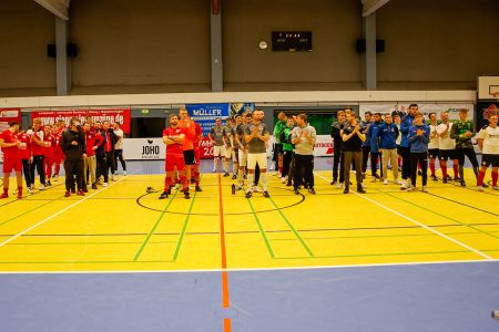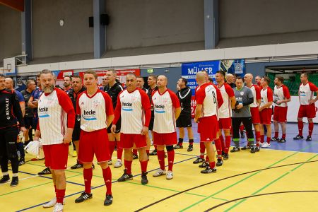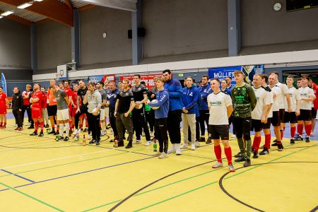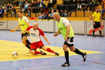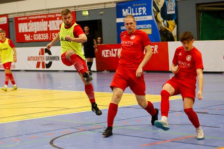 Damit war der erste Tag des Neujahrsturnier aber noch lange nicht zu Ende, das Highlight sollte erst noch folgen. Am Abend fand natürlich noch, wie es zum Neujahrsturnier einfach dazugehört, der Vergleich der Traditionsmannschaften statt. Sieben Teams waren der Einladung gefolgt, unser Greifswalder FC natürlich ebenfalls. Außerdem kamen der HFC Greifswald, der TSV 1860 Stralsund, der FC Landhagen, der 1. FC Neubrandenburg, der SV Bad Kleinen und sogar die BSG Stahl Riesa in die Mehrzweckhalle, um sich um den begehrten Pokal zu messen! Vor allem hierbei noch zu erwähnen, war auch der Einsatz zweier sehr großer Schiedsrichtertalente. Zum einen durfte der erst 14-jährige Lenny Mohr an der Pfeife unterwegs sein und wichtige Erfahrungen auf dem Weg zu einer hoffentlich tollen Schiedsrichterkarriere sammeln. Und zum anderen war auch der junge Danny Gerth mit dabei, der sogar die Spiele seines Vaters, Legende Mike Gerth, pfeifen durfte. Übrigens war das nicht die einzige Vater-Sohn-Geschichte bei diesem Turnier: Im Kader von Stahl Riesa stand mit der Nummer 15 Volker Marx. Und der ist der Vater einer unserer Regionalligaspieler. Nein, nicht von Jonas Marx, sondern von unserer Nummer 15, Niclas Kubitz!