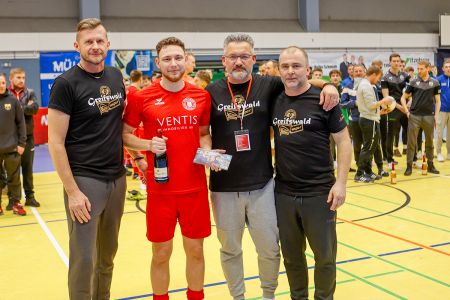In den Halbfinals ging es dann nochmals heiß her. Zunächst traf unser Greifswalder FC auf den TSV 1860 Stralsund. Das Spiel verlief zu Beginn relativ eng und Stralsund blieb ein unangenehmer Gegner. Erst gegen Ende war unsere Verbandsligareserve dann eiskalt und schnappte sich den 4:1-Sieg. Knapper war es im anderen Halbfinale. Dort fielen lange Zeit keine Tore, bis kurz vor Ende dann doch die Görminer in Führung gingen. Aber fast postwendend gelang Wolgast der Ausgleich. Es blieb beim 1:1 und das Neunmeterschießen musste die Entscheidung herbeiführen. Dort waren zunächst alle Schützen treffsicher, ehe der vierte Schütze der Wolgaster vergab und Görmin so mit 5:4 gewann. Im Spiel um Platz 3 unterlagen die Wolgaster dann trotz richtig starker Leistung mit 2:4 gegen Stralsund. Das heiß ersehnte Finale war im Anschluss die Neuauflage des Eröffnungsspieles. Der SV 90 Görmin traf auf unseren Greifswalder FC, und es wurde die enge Kiste, die sich die Zuschauer erhofft hatten. Zur Freude der Görminer war es tatsächlich der SV 90, der die Führung erzielte. Das ließ unsere U23 aber nicht auf sich sitzen und glich postwendend aus. Danach war es hochspannend, das Spiel schien in jede Richtung laufen zu können. Ein Geistesblitz von Daniel Eidtner war es, der es zugunsten unseres GFC kippen ließ. Ein Freistoß, den er überraschend mit seinem schwächeren linken Fuß ausführte, sorgte für das 2:1, ehe Eidtner mit dem 3:1 den Deckel drauf machte. Er wurde am Ende auch Torschützenkönig, während der geschlagene Görminer Torhüter Tom Borchardt seinen Titel als bester Torhüter, den er bereits vor vier Jahren erhielt, verteidigen konnte. Der Anhang feierte das Team des Zweitplatzierten trotzdem sehr und das auch zurecht. Der Sieg ging allerdings an die Gastgeber, unseren Greifswalder FC, der damit einem großartigen Event und dem Comeback des Neujahrsturnieres die Krone aufsetzte. Und schon jetzt laufen die Planungen für das nächste Jahr, denn diese fantastische Veranstaltung soll niemals mehr von der Landkarte verschwinden!