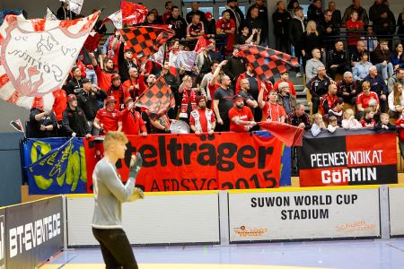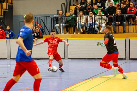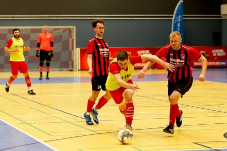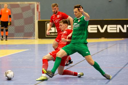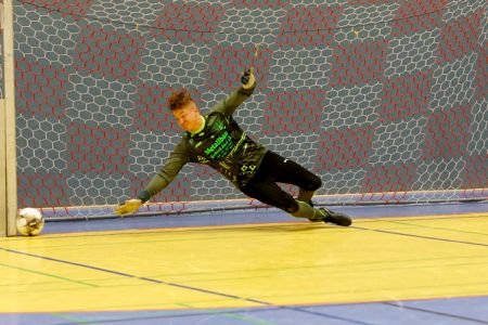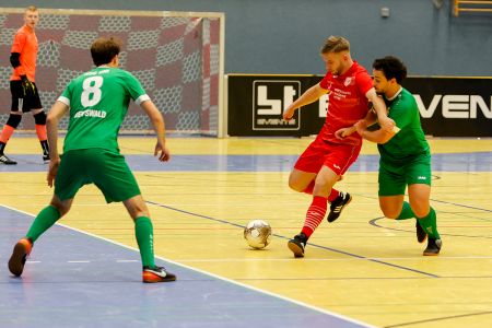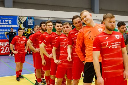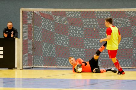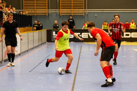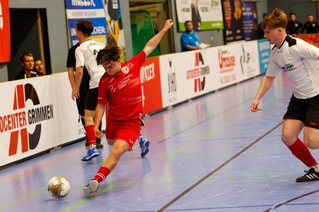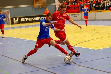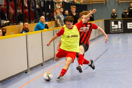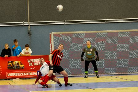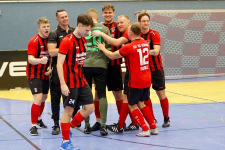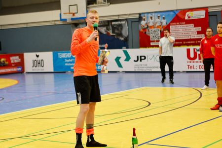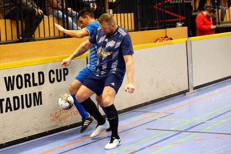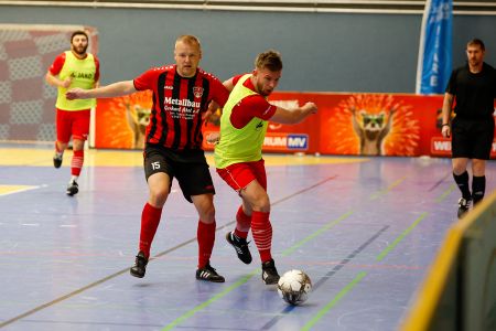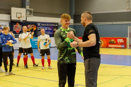 Am Sonntag ging es dann mit dem Finaltag weiter. Nun stießen auch die Verbandsligisten 1860 Stralsund sowie unsere U23 vom Greifswalder FC als gesetzte Teams mit dazu und komplettierten die beiden Vierergruppen. Direkt zu Beginn gab es das Duell zwischen unserem GFC und dem SV 90 Görmin, begleitet von einer heißen Stimmung von den Rängen. Das erste Turniertor gelang dann unseren Greifswaldern durch den kleinen Niklas Mieß, der auch im Verlaufe des Turnieres einer der stärksten Spieler sein sollte. Am Ende siegten unsere Jungs klar mit 5:1 und schlugen danach auch Lubmin mit 4:0. Damit stand das Weiterkommen fast schon fest. Es sollte aber noch brisant werden: Die am Vortag so starke HSG unterlag Görmin deutlich mit 4:1 und musste somit unbedingt gegen unseren GFC gewinnen. Durch einen Treffer von Robert Müller gelang dies auch knapp mit 2:1. So musste Görmin das letzte Spiel der Gruppe gegen Lubmin mit mindestens drei Treffern Vorsprung gewinnen, um das Halbfinale zu erreichen. Es entwickelte sich zur hitzigsten Partie des Turnieres, denn der Sturmvogel warf alles rein. Mehrere Zeitstrafen unterstrichen die Emotionen, was Görmin allerdings bis zu einer 4:0-Führung nutzte. Es blieb aber spannend, denn Tom Gohl verkürzte. Ein weiterer Treffer fiel aber nicht, sodass Görmin als Halbfinalist feststand. In der zweiten Gruppe war die Messe bereits vor dem letzten Spiel gelesen. Rot-Weiß Wolgast entthronte durch einen 3:1 im direkten Duell noch 1860 Stralsund und entging so dem GFC im Halbfinale, während Stralsund bereits durch war.
