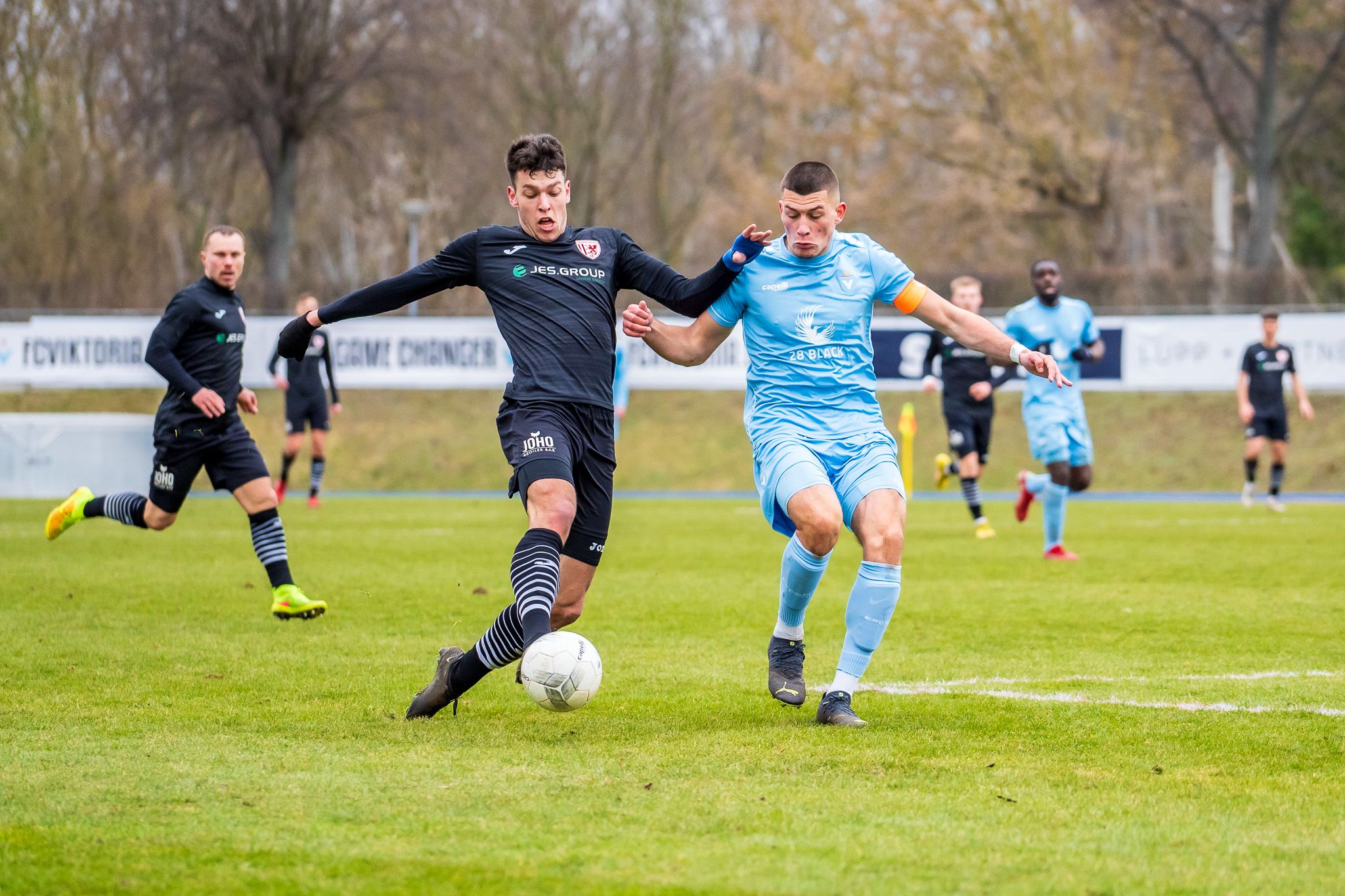 Die Partie war auf 90 Minuten gesehen sehr hektisch. Beide Teams konnten nie die volle Kontrolle über die Partie übernehmen. Immer wieder waren es Ballverluste, die dann zu Torchancen führten. Die frühe Führung für Viktoria erzielte bereits nach fünf Minuten Christopher Theisen, der durch einen Geniestreich von Enes Küc allein vor Jonas Brendieck keine Probleme hatte und seinen sechsten Saisontreffer erzielen konnte. Diesem Rückstand musste unser Team nun hinterherlaufen und so richtig lief im letzten Drittel nichts. Die beste Chance hatte noch Joe-Joe Richardson, der am Fünfmeterraum zum Schuss kam, doch den Ball nicht richtig traf. Die Viktoria verteidigte es dann immer wieder gut und ging mit der verdienten Führung in die Halbzeit.