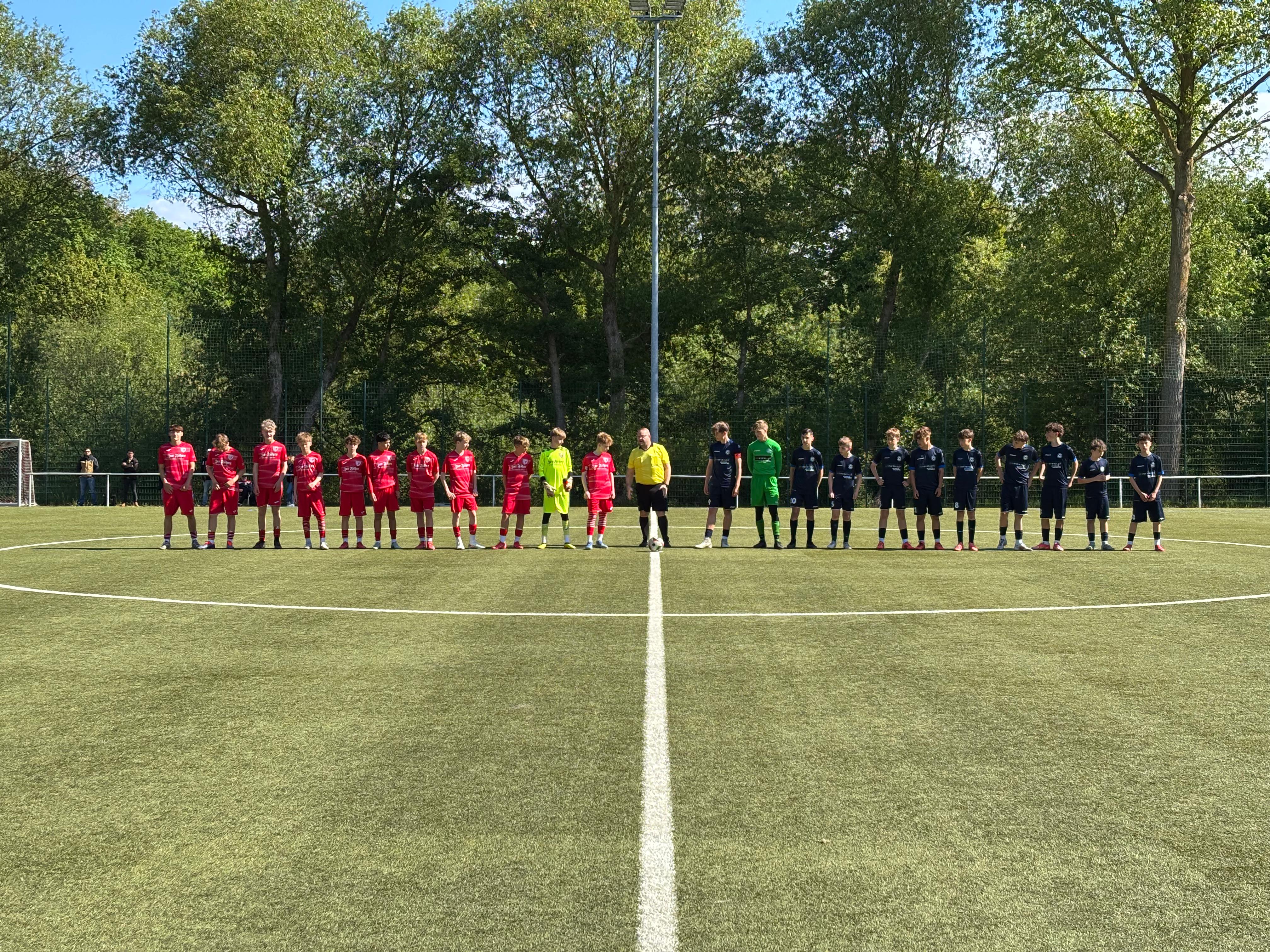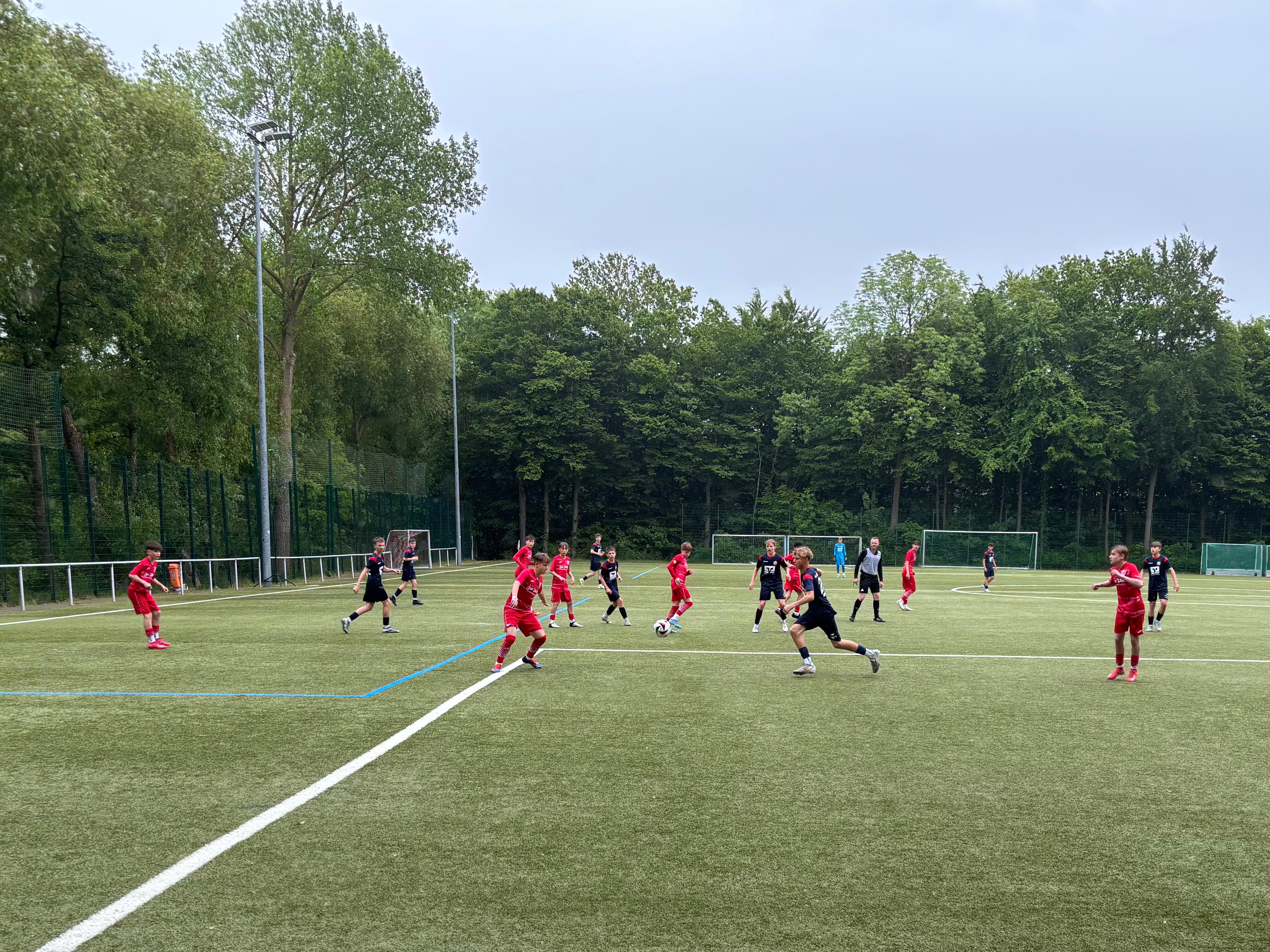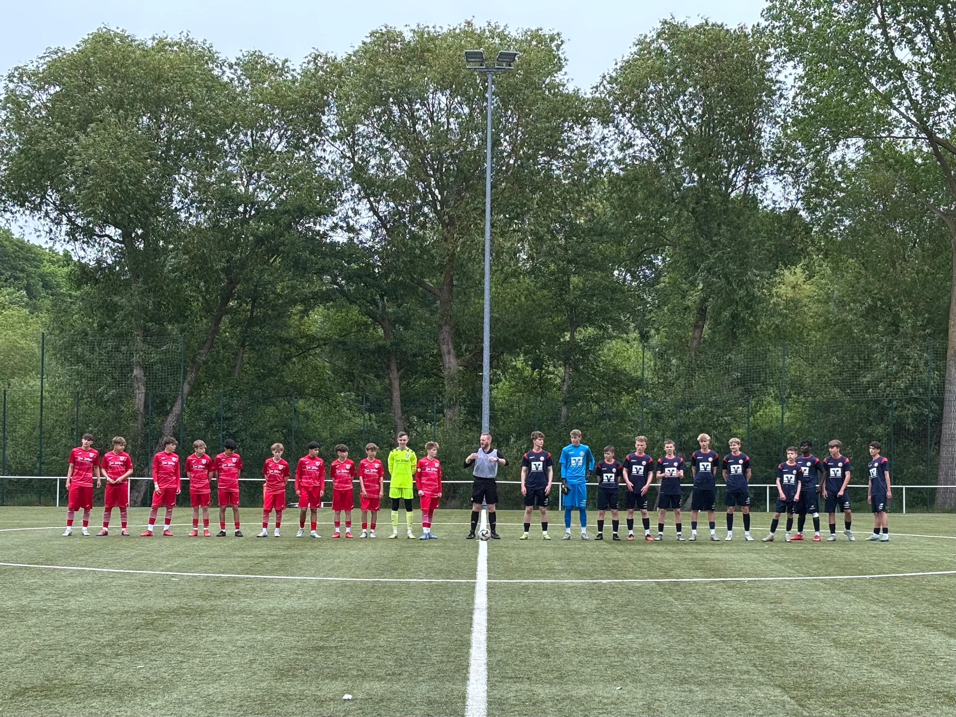 Eine bittere Niederlage musste hingegen unsere U14 einstecken. Im Duell mit den gleichaltrigen Jungs des FC Förderkader René Schneider entwickelte sich zunächst eine Partie auf Augenhöhe. Beide Seiten hatten einige gute Ansätze, unsere Jungs spielten die durchaus guten Gelegenheiten allerdings nicht immer sauber genug aus und verpassten somit den Führungstreffer. Nach etwas mehr als 25 Minuten trafen dann leider die Gäste durch eine Bogenlampe ins lange Eck. Danach war das Team von John-Philipp Bruhns leicht geschockt, kassierte nur eine Minute später fast noch das zweite Gegentor. Dies geschah dann leider in der 32. Minute dann wirklich. In Halbzeit zwei lief das Team zwar weiter an, es ergaben sich aber nur wenige klare Möglichkeiten. Auf der anderen Seite hatte die U14 bei einem Lattentreffer des Förderkaders noch etwas Glück. So blieb es beim bitteren 0:2.