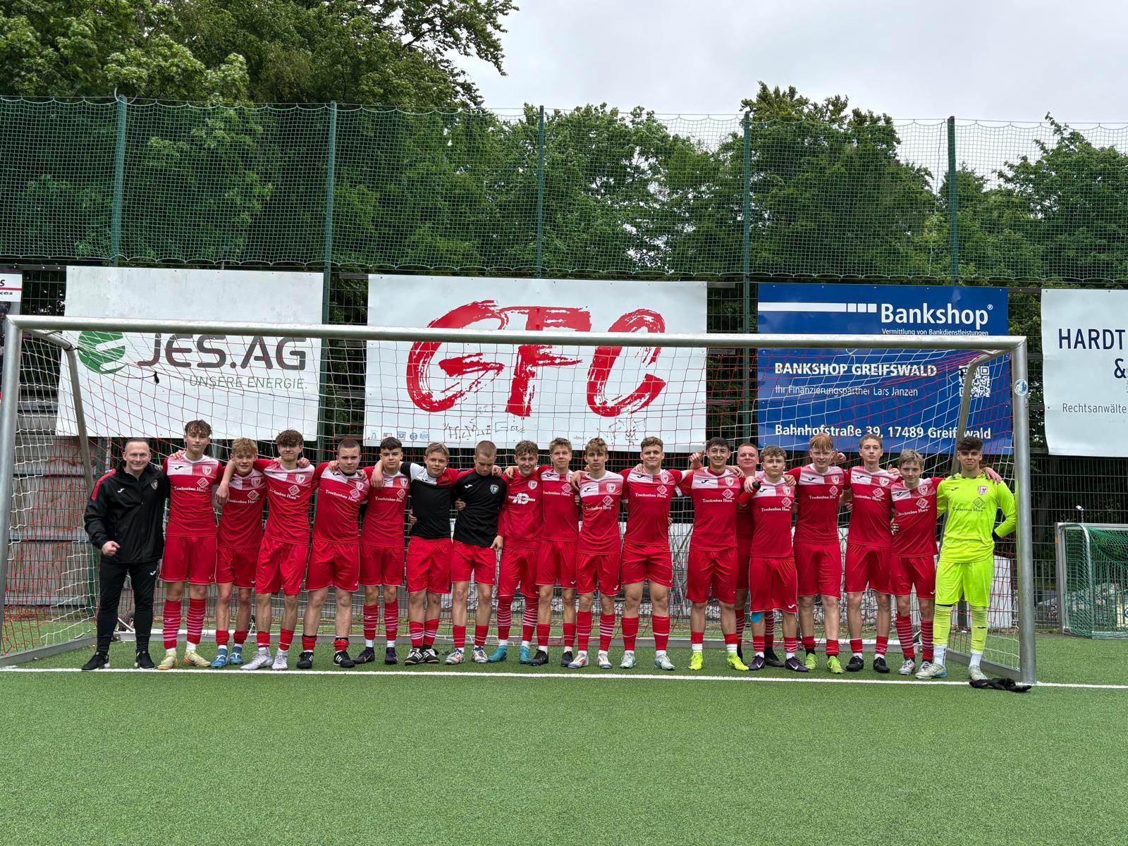 Unsere Jungs waren an diesem Sonntag sehr willensstark und giftig. Sie setzten den älteren Schwerinern in jeder Situation des Spiels ordentlich zu. Wir sahen ein Spiel auf Augenhöhe. Unsere U14 technisch sauber unterwegs, die Gäste körperlich überlegen. Schwerin versuchte mit langen Diagonalschlägen, ihre schnellen Läufer in Szene zu setzen. Unser Team wehrte in Halbzeit eins aber diese gefährlichen Vorstöße ab. Kurz vor der Pause dann zwei Schlüsselmomente. Eine stramme Hereingabe der Schweriner konnte unser Keeper nicht im ersten Kontakt festmachen, beim Nachgreifen stand dann ein Schweriner goldrichtig und drehte das Spiel zu Gunsten der Gäste. Auf der anderen Seite stand erneut Piet Hoffmann wieder goldrichtig und frei vor dem gegnerischen Keeper, den strammen Abschluss in die lange Ecke ahnte jedoch der großgewachsene Schlussmann und hielt die Gästeführung fest. Nach der Pause war unsere U14 wieder mit Kampf und Körpereinsatz unterwegs, belohnte sich mit tollen Aktionen gegen den Ball. Wir tauchten noch zwei, dreimal gefährlich vor dem gegnerischen Tor auf, schlossen jedoch nicht in letzter Konsequenz ab. Schwerin nutzte wiederum die sich immer mehr auftuenden Schwachstellen in der Greifswalder Defensive aus. Die Kräfte schwanden zusehends und Mecklenburg Schwerin erhöhte schlussendlich auf 1:5. Mal abgesehen vom Ergebnis war es eine super Mannschaftsleistung unserer Jungs! Sie kämpften bis zum Schluss, fingen leider in Halbzeit zwei nach Standards und Querschlägern teils unglückliche Gegentore.