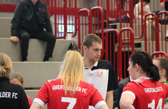 „Ich möchte auf jeden Fall sehen, dass wir viel Spaß haben und dass sich alle individuell verbessern. Ich möchte dann merken, dass sich hier was getan hat“, sagt Fabian Stei über seine Ziele mit dem Team. Über eine Freizeitfußballgruppe, in der auch Ex-Trainer Lucas Passvogel aktiv war, fand der 29-Jährige den Weg zu unserem Greifswalder FC. „Wir haben da öfter drüber gesprochen. Da ich sowieso schon immer Freude an Fußball hatte und auch den Trainerjob an sich schon immer spannend fand, wollte ich es mal ausprobieren“, so Stei. Ähnlich wie sein Vorgänger wurde auch Fabian direkt bei einem Hallenturnier, in seinem Fall sogar die Hallenlandesmeisterschaft, quasi ins kalte Wasser geworden. „Ich kannte noch niemanden und wusste nichts von den Abläufen. Und dann plötzlich bei so einem Turnier direkt alle kennenzulernen, war schon sehr komisch“, sagt Fabi schmunzelnd. Aber der Mann aus der Nähe von Marburg wurde super aufgenommen und hatte auch Unterstützung. „Ich wurde vom Team super aufgenommen und dass ich dann mit Amira und Jule Krakow auch schon zwei tolle Co-Trainerinnen an der Seite hatte, half mir sehr“, bestätigt Fabian und fügt an: „Das mit den gemeinsamen Kabinenansprachen vor dem Spiel hat dann schon ganz gut geklappt. Ich freue mich jetzt aber auch den Trainingsbetrieb zu übernehmen und dann auch an Sachen zu arbeiten.“ Und das wird er eben nicht alleine machen. Auch weiterhin wird Amira Haftendorn ihn tatkräftig zur Seite stehen. „Ja, ohne sie würde es nicht gehen. Punkt“, so Stei.