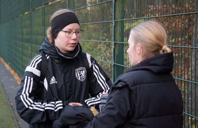 Als Trainerteam werden die beiden dann auf einer Ebene agieren. Beide sind nicht die autoritärsten Typen, wollen aber authentisch bleiben und dann auf der „Kumpelschiene“ agieren. „Also ich sehe es schon so, dass Fabi jetzt eher der Trainer ist und auch mehr Trainingsplanung macht, ein Konzept entwickelt und ich dann meine Ideen einbringe. Ich denke das liegt mir. Aber er hat auch schon viel gefragt, was meine Erfahrungen sind und wie ich so die Mannschaft einschätze. Ich merke dadurch auch sehr viel Respekt mir gegenüber. Also würde ich sagen, sind wir ebenbürtig“, bestätigt Amira. Fußballerisch soll es vor allem um Spielkontrolle gehen. Die Mädels sollen ihr Spiel spielen und selbstbewusst auftreten. „Also gerne dann den Ball auch mal laufen lassen. Vielleicht auch nicht überfallartig attackieren, sondern sich langsam vorarbeiten und dann aufs Kombinationsspiel setzen. Das macht mir am meisten Spaß anzuschauen. Und bei Ballverlust dann möglichst schnell mit Gegenpressing reinkommen, um den Ball dann wieder zu gewinnen. Den Gegner quasi ersticken“, beschreibt es Fabian. So soll es eine gesunde Balance geben zwischen Spaß und Ernsthaftigkeit. „Also ich möchte schon, dass die Spielerinnen mit Leidenschaft dabei sind und das auch ernst nehmen. Besonders beim Thema Anwesenheit oder Absagen. Da wünsche ich mir ein bisschen mehr Ernst. Wir sind ja auch eine Mannschaft, es ist ein Mannschaftssport und da geht es um Vertrauen und Kommunikation“, sagt Amira.