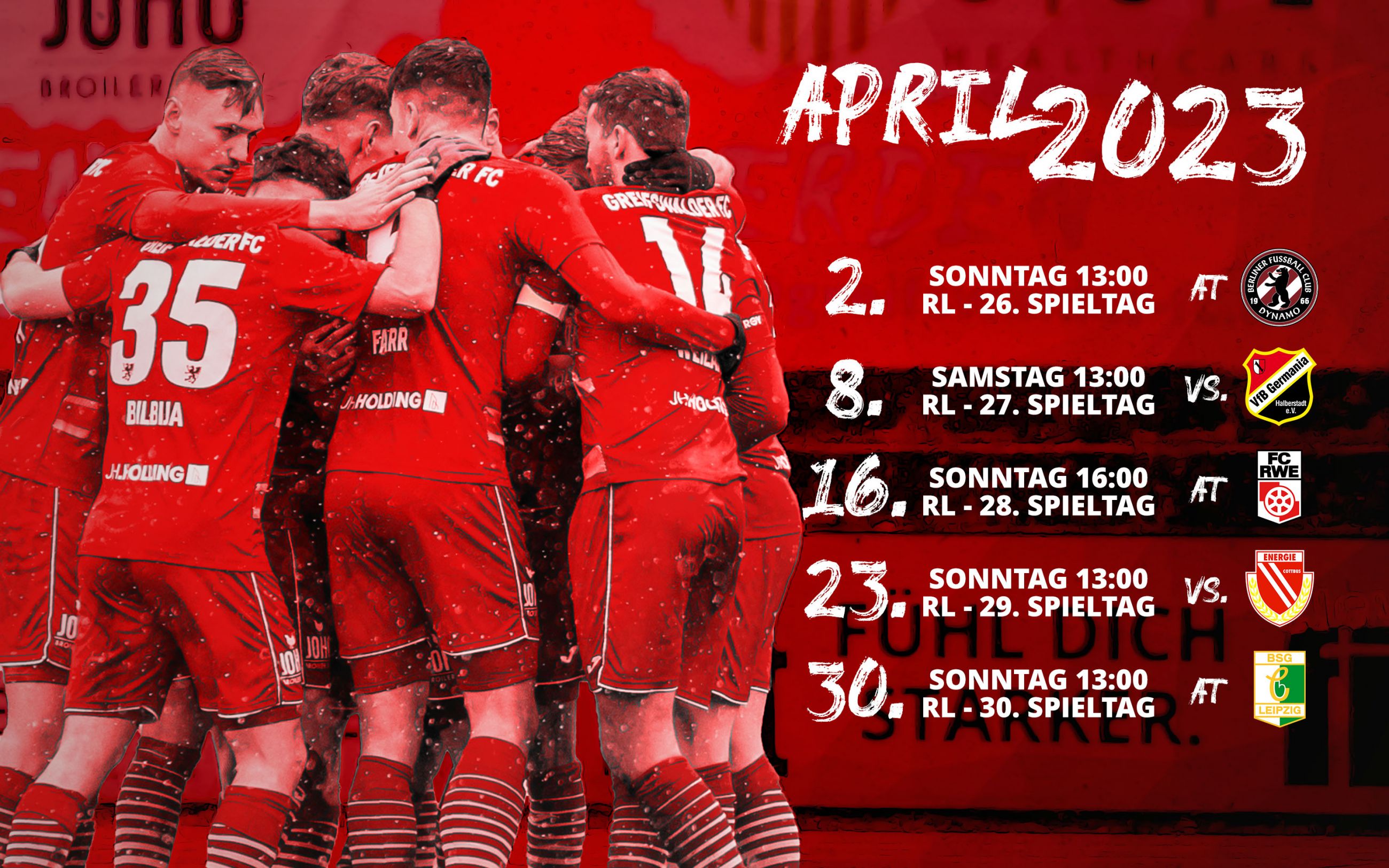 Der Nordostdeutsche Fussballverband setzte am Montag die Spieltage 26 bis 30 zeitgenau fest. Am Sonntag, den 2. April geht's für unseren GFC zum amtierenden Regionalliga-Meister BFC Dynamo. Nur sechs Tage später, am 8. April (Ostersamstag) kommt Germania Halberstadt ins Volksstadion. Nach Ostern folgen drei weitere Kracher - Erfurt (Sonntag, 16. April), Cottbus (Sonntag, 23. April) und Chemie (Sonntag, 30. April). Wir haben mittlerweile schon sehr viele Ticketanfragen für unser Heimspiel gegen den ehemaligen Bundesligisten Energie Cottbus erhalten. Der Ticketvorverkauf (Online und in unseren VVK-Stellen) startet am Montag, den 20. März um 10 Uhr.