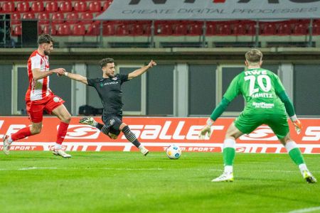 Der Start in die Partie hätte für unsere Jungs kaum besser laufen können. RWE-Keeper Manitz rutschte im Aufbauspiel der Ball über den Schlappen genau in den Fuß von Benyamina. Dieser schlug einen Haken und setzte Kocer in Szene. Der 35-Jährige stand frei vor dem Tor und traf zum 1:0 für den GFC (7.). Doch nach dem guten Beginn ließen unsere Jungs nach. Werner verhinderte in der 11. Minute mit einer starken Parade den Ausgleich. Die Erfurter blieben weiterhin dran, hatten mehr Spielanteile und auch die besseren Chancen. Kurz vor der Pause vergab Seaten aus fünf Metern freistehend die größte Möglichkeit (40.).