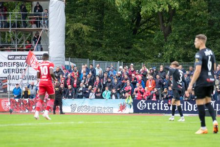 Nach dem Seitenwechsel kam unser Team energischer zurück auf den Platz. Vier Minuten dauerte es auch nur, da waren unsere Jungs auch schon erfolgreich. Jannis Farr büffelte mal wieder über die rechte Seite und brachte noch die Flanke. Diese verpasste Soufian Benyamina in der Mitte zwar, doch Manassé Eshele stand goldrichtig am zweiten Pfosten und musste nur einschieben. Er setzte seinen Lauf damit fort und traf nun schon im vierten Ligaspiel in Serie. Zudem war es der erste Regionalligatreffer unseres Greifswalder FC gegen Rot-Weiß Erfurt überhaupt. Danach setzten unsere Jungs die Gegner weiter gut unter Druck, jedoch spielten sie die Situationen nicht immer sauber aus. Mal kam ein Pass zu spät, mal gar nicht, mal wurde die falsche Entscheidung getroffen. Klare Gelegenheiten ergaben sich nicht und so kam auch Erfurt nochmal. Zunächst kam Cabral rechts im Strafraum aus naher Distanz zum Abschluss, worauf hin Jakub Jakubov den Ball überragend parierte. Nach 81 Minuten war es dann noch knapper, als der eingewechselte Langner frei auf Jakubov zulief, unsere Nummer eins aber erneut seine ganze Klasse unter Beweis stellte und klärte. Die letzte Gelegenheit hatte dann aber doch unser GFC. Ein abgefälschter Weitschuss von Can Coskun brachte Erfurt-Keeper Schellenberg jedoch nicht in Bedrängnis. Kurz vor Abpfiff gab es für ein taktisches Foul dann noch die Gelb-Rote Karte für Erfurts Til Linus Schwarz, der aber nichts mehr verpasste, denn es blieb beim 1:1-Unentschieden.