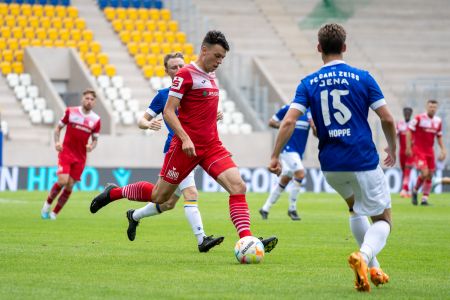 Am Ende haben wir einen Punkt mehr auf dem Konto, verlieren aber auch zwei Zähler in den letzten Minuten des Spiels. Denn unsere Kicker führten durch den Benyamina-Treffer und bekamen erst in der Nachspielzeit den Ausgleich. Trotzdem zeigten unsere Kicker ein gutes Spiel und verdienten sich diesen Punkt beim Meisterschaftsfavoriten FC Carl Zeiss Jena.
