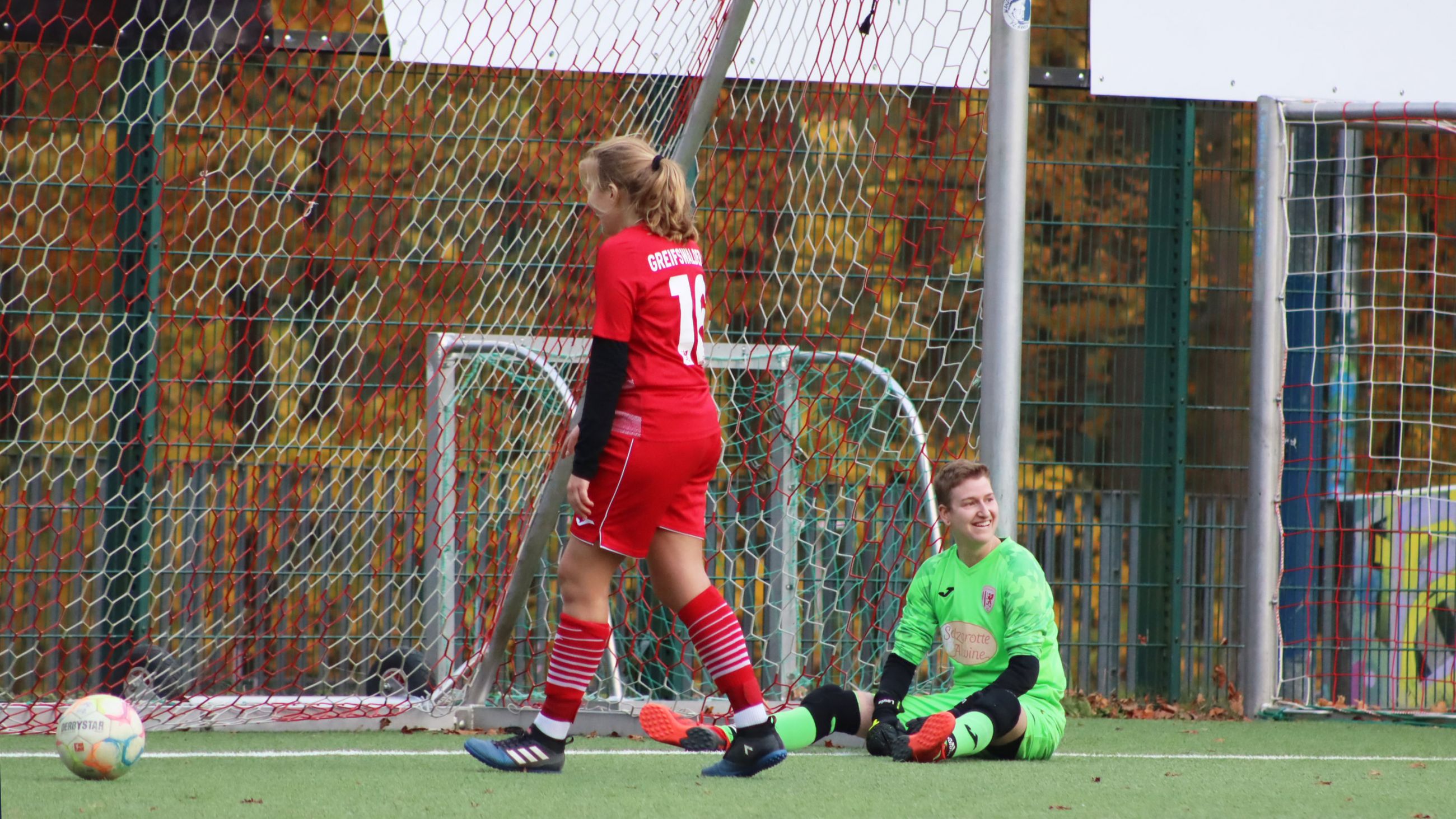 Nicht ganz so erfolgreich lief das Wochenende leider für unsere B-Mädchen und unsere Erste. Die B-Mädels fuhren am Samstag im Anschluss an das Regionalligaspiel der ersten Herren nach Stralsund, um dort auf den „punktgleichen“ Rivalen zu treffen. Zwischen den beiden Teams kracht es oftmals gewaltig und die Spannungen waren auch dieses Mal wieder zu spüren. Nach nur zwei Minuten passierte dann schon das Worst-Case-Scenario aus unserer Sicht. Stralsund ging in Führung und machte es damit unseren Mädels natürlich besonders schwer. Aber die blieben fokussiert und belohnten sich dafür auch nur wenige Minuten später. Lia Bücke steckte den Ball zu Pauline Behnke durch, lief aber weiter mit nach vorne. Behnke legte den Ball dann etwa einen Meter vor dem Strafraum zu Bücke zurück, die nahm ihn kurz an und schweißte ihn dann rechts unten ins Eck. Es war schon der dritte Saisontreffer der Verteidigerin. „Ich freue mich da natürlich sehr drüber. Mein Saisonziel war es, mehr Tore zu schießen als im letzten Jahr. Das habe ich jetzt schon geschafft“, so die Vize-Kapitänin. Leider war dies an diesem Tag aber einer der wenigen Gründe zur Freude. Zum einen gab es leider erneut sehr viele Provokationen und Nickligkeiten auf dem Platz, hier und da wurde wieder mal versucht nachzutreten, aber dieses Mal blieben unsere Mädels ruhig und ließen sich nicht darauf ein. Dennoch hatte Stralsund die besseren Torabschlüsse auf seiner Seite und auch, wenn Emma Börner bei uns im Tor einige der Tormöglichkeiten entschärfen konnte, konnte sie an diesem Tag auch nicht alles halten. Sieben der acht Stralsunder Treffer an diesem Tag fielen von außerhalb des Strafraumes. „Da müssen wir uns besser abstimmen. Wir müssen da sofort drauf gehen, so kann es natürlich nicht weitergehen“, bilanziert Lia Bücke. Krönung des gebrauchten Tages war dann auch noch die Verletzung von Emma, für die Enya Stolz ins Tor rücken musste. Emma geht es mittlerweile aber Gott sei Dank wieder gut. Durch das 1:8 endet die Hinrunde leider nicht sehr erfolgreich, doch kommende Woche in Schwerin erhoffen sich die Mädels schon wieder Besserung.