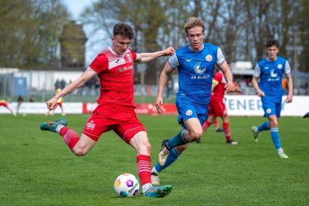 Wie die Partie dann begann, hatte sich auf Greifswalder Seite im Vorfeld wohl niemand so vorgestellt. Eine Freistoß-Flanke nach Eglseder-Foul bugsierte Schmedemann ins eigene Netz – bereits früh die kalte Dusche für unsere Jungs (9.). Doch es kam danach noch dicker: Werner spielte einen Fehlpass im Aufbau, Rostocks Singh holte sich die Kugel und legte zu Wollschläger rüber, der nur noch einschieben musste (12.). Es war ein katastrophaler Auftakt, der seinen Höhepunkt im 3:0 von Brzozowski fand. Der polnische Junioren-Nationalspieler konnte ungehindert ins Zentrum dribbeln und versenkte den Ball mit seinem starken linken Fuß aus der Distanz (21.). Kurz darauf hätte Bachmann für den FCH sogar noch das vierte Tor erzielen können, doch er konnte die Kugel nicht entscheidend an Werner vorbeispitzeln (22.).