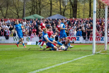 In der zweiten Halbzeit agierten unsere Jungs nach der Einwechslung zur Pause von Eshele und der späteren Hereinnahme von Manske dann mit vier Stürmern. Wirklich Durchschlagskraft entwickelte sich dadurch allerdings auch nicht. Eshele wurde in der 65. Minute von Benyamina freigespielt, setzte die Direktabnahme allerdings weit über den Kasten. Drei Minuten später verhinderte Werner mit einer starken Parade gegen Dietze das 0:4.