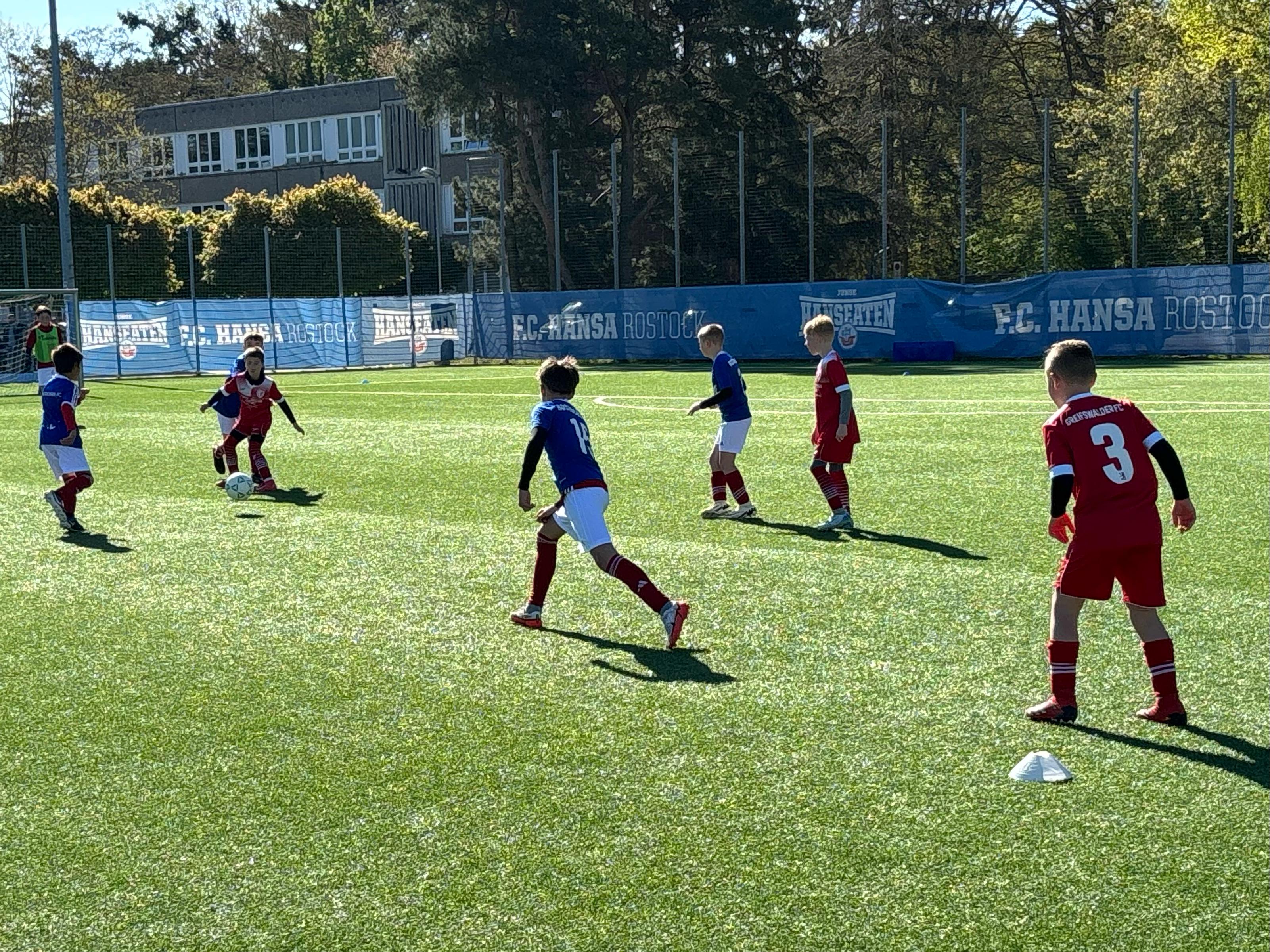Lange konnte sich die Mannschaft aber nicht auf dem Erfolg ausruhen. Nach einem Ausflug zum Hansa-Spiel gegen 1860 München ging es am Samstag gegen die gleichaltrigen Jungs des HFC Greifswald. Dieses Ligaspiel wurde mit 17:1 sehr souverän gewonnen. Aber auch das war letztlich nur Zwischenstation zum letzten Event der Woche. Sonntag ging es zu einem Leistungsvergleich des Perspektivteams des F.C. Hansa Rostock. Die U11 des Rostocker FC und die U10 von Mecklenburg Schwerin waren ebenfalls dabei. Nach zwei deutlichen Siegen über den Rostocker FC (5:0) und Hansa (5:1) unterlagen sie leider nach einer 2:1-Führung noch dem Team aus der Landeshauptstadt. Am Ende war es ein 2:4, was aber einen großartigen zweiten Platz zum Resultat hatte. Glückwunsch und jetzt ruht euch erst mal aus, Jungs!