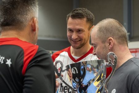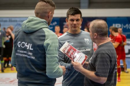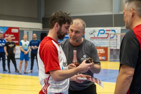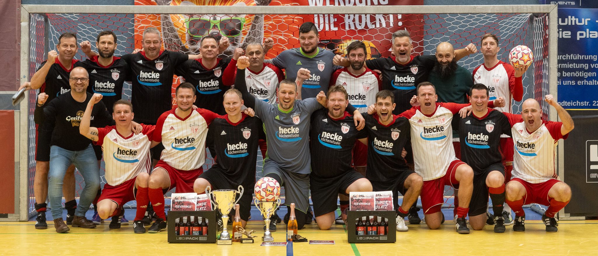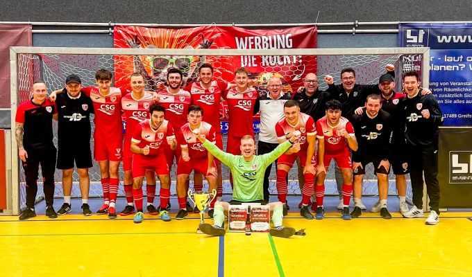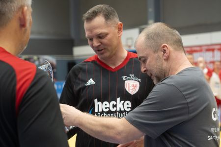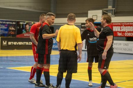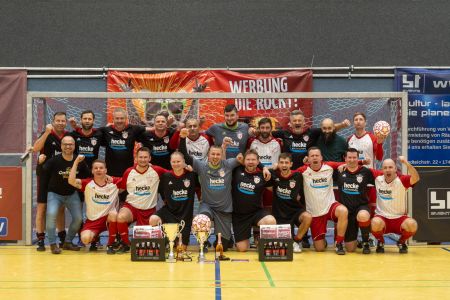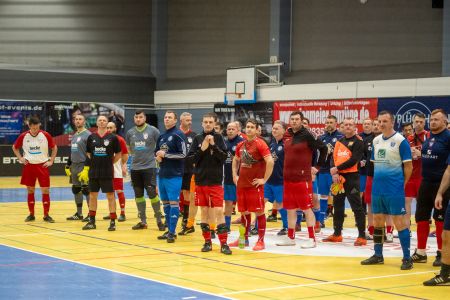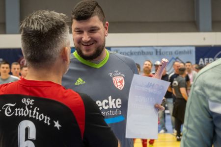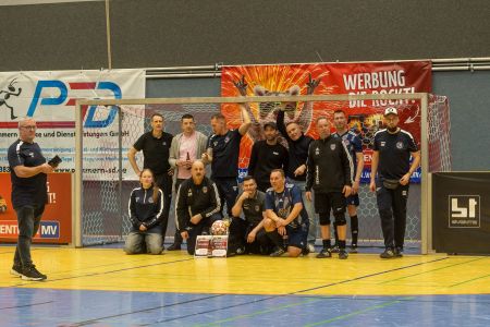 Der Samstagabend beim Neujahrsturnier gehört traditionell den Alten Herren. So war es auch im Jahr 2025 und Sieger war wieder einmal die Traditionsmannschaft des Greifswalder FC. Und dieses Mal ging es sogar doppelt aufs Podium, denn der GFC stellte kurzfristig gleich zwei Teams und fuhr als Erster und Zweiter ins Ziel. Leider gab es knapp eine Woche vor dem Turnier noch Absagen und somit mussten Nachrücker gefunden werden, die sich auch fanden. Lok Stralsund, Kirchdorf und Lubmin meldeten kurzfristig ein Team und nahmen am Turnier teil. An dieser Stelle nochmal vielen Dank für die Spontanität. Aber nun mal schnell rein ins Turnier. Es war von Beginn an spannend und die gut gefüllte Mehrzweckhalle sah teilweise gepflegten, aber auch harten Hallenfussball. Vor allem sollen aber Tore fallen und damit ging es im ersten Spiel erstmal nicht so wirklich los. Die erste Mannschaft des GFC siegte knapp mit 1:0 gegen Sturmvogel Lubmin. In den folgenden Partien wurde aber immer häufiger eine der vielen verschiedenen Torhymnen gespielt. Insgesamt fielen 73 Tore in 21 Spielen. Damit kann man auf jeden Fall zufrieden sein. Die beiden GFC-Teams waren natürlich auch in dieser Statistik führend, siegten in den ersten Spielen und lagen gleichauf. Bis GFC I ein Ausrutscher passierte, denn das Spiel gegen den ESV Lok Stralsund ging mit 2:3 verloren. Im direkten Duell in Spiel 18 ging es für GFC II schon um den Turniersieg, doch den wollte GFC I nicht so einfach hergeben und siegte mit 2:1 gegen die eigenen Teamkollegen. Im letzten Spiel des Abends hätte GFC II dann tatsächlich noch den Turniersieg aus eigener Kraft schaffen können, in dem man mit fünf oder mehr Toren Unterschied gegen den SV Sturmvogel Lubmin gewinnt. Das war aber nicht der Fall und somit mussten sich die Kicker um den mitspielenden Trainer Heiko Bischof mit dem zweiten Platz vergnügen. Bronze sicherte sich der HFC Greifswald 92, der im direkten Duell mit dem TSV 1860 Stralsund durch einen spät verwandelten Foulelfmeter durch Stefan Schwarz einen Punkt holte und somit nicht mehr vom Treppchen zu werfen war. Als bester Torschütze wurde nach dem Turnier Ronny Krüger ausgezeichnet, der in sechs Partien sieben Mal für GFC I traf. Auch der beste Keeper kam vom GFC, aber dieses Mal von der zweiten Mannschaft. Phillip Zimmermann zeigte viele starke Paraden und verdiente sich die Auszeichnung.