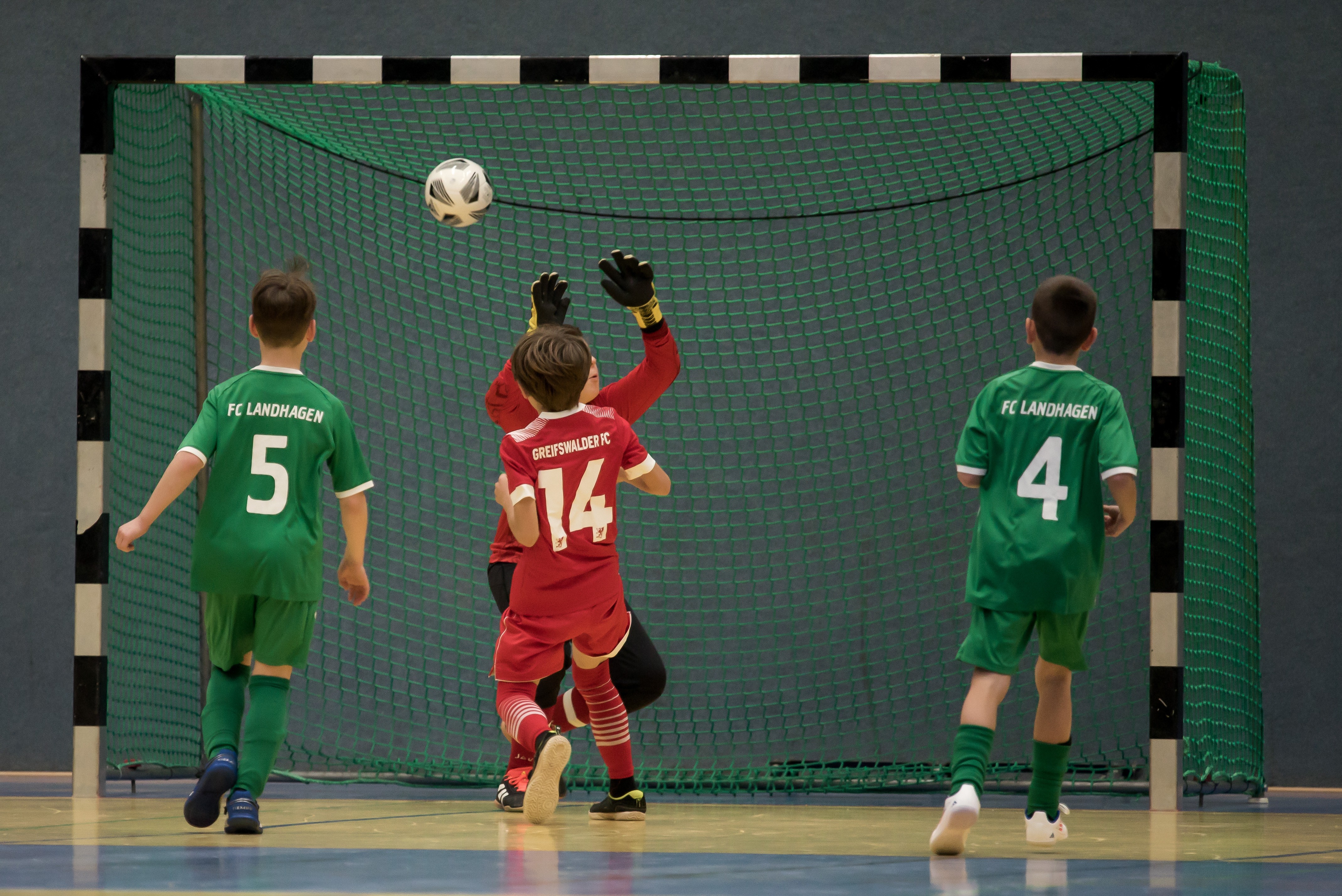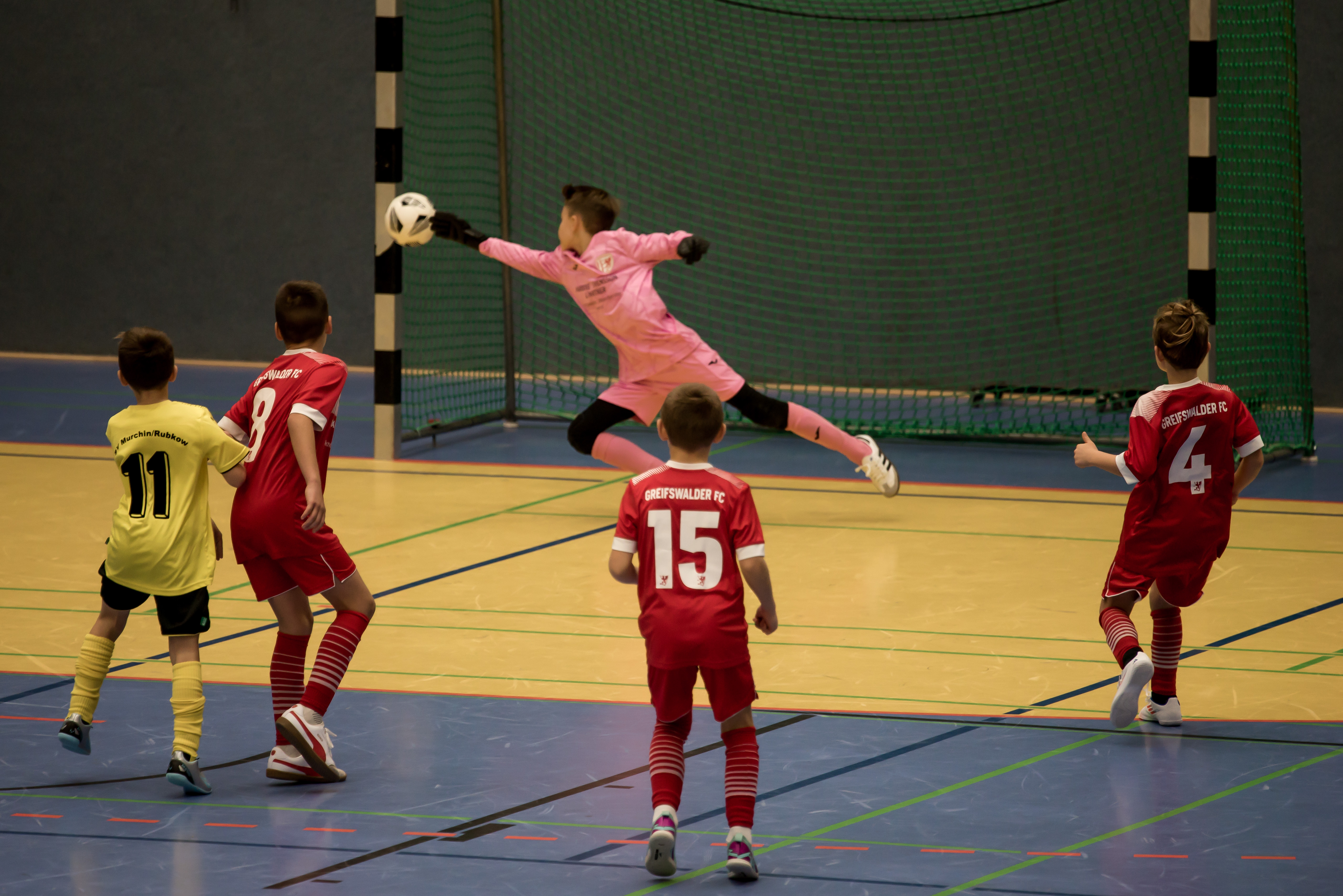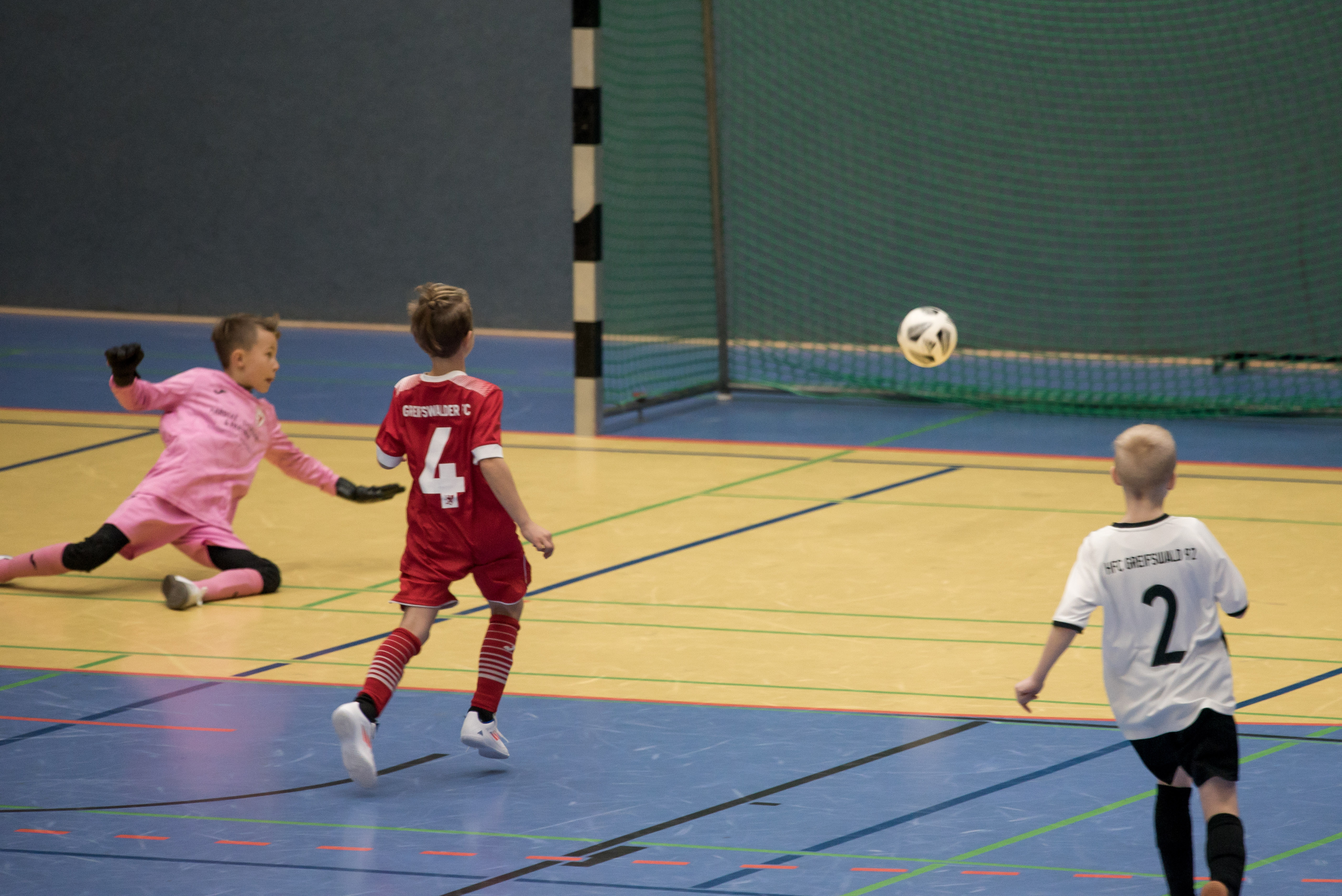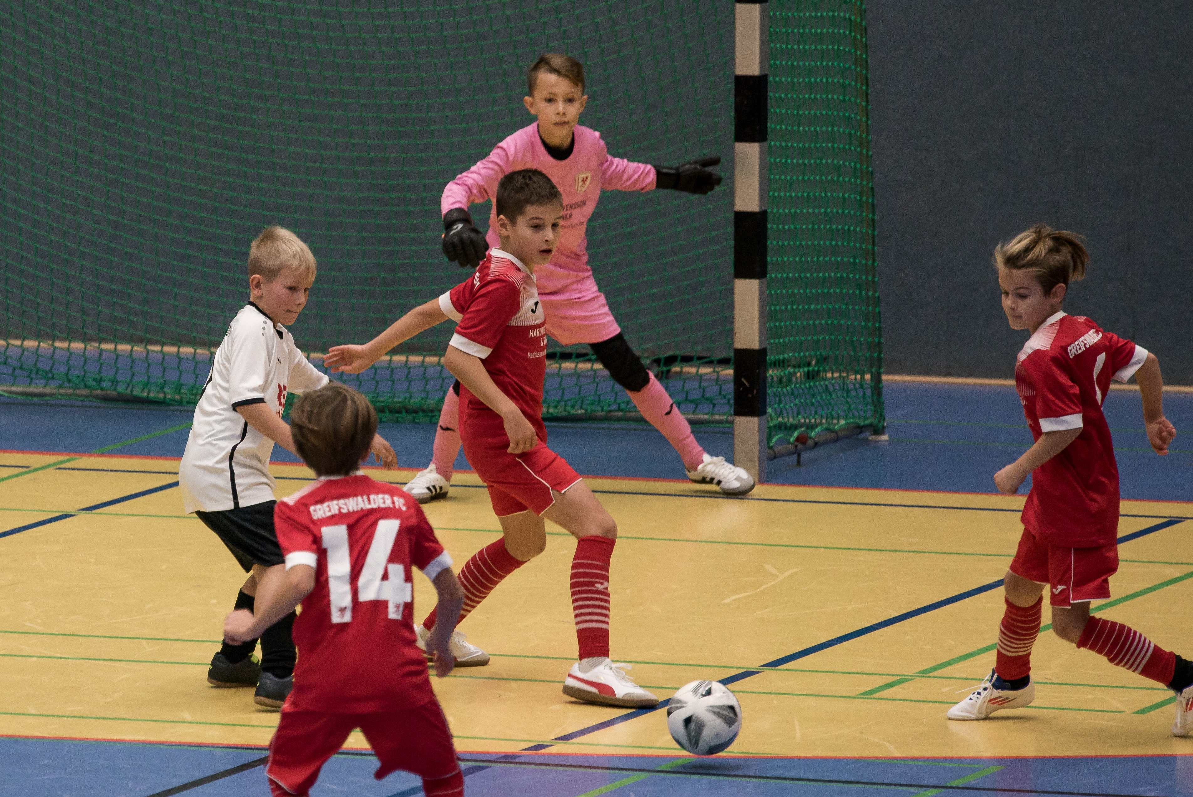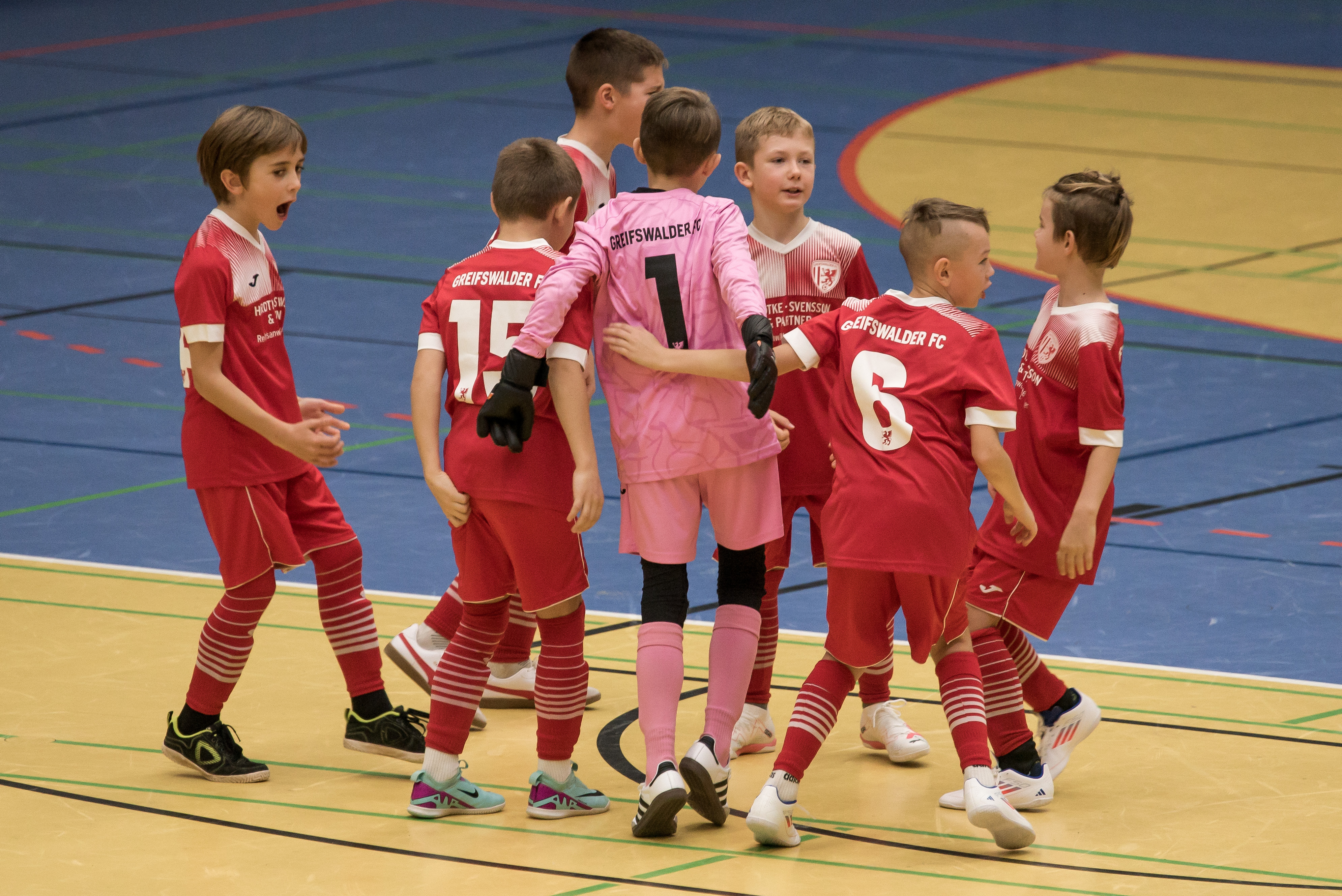 Bereits am Vormittag war die erste Truppe dran, die sich bis zum letzten Gruppenspiel schadlos hielt. Gegen Landhagen II, die SG Kaiserbäder II, die SG Kröslin/Lubmin und den HFC Greifswald siegte man ohne Gegentor. Erst der SV Murchin/Rubkow überwand unsere Hintermannschaft. Nichtsdestotrotz zeigte sich unser Team auch hier nervenstark und siegte schlussendlich mit 2:1. Fünf Siege aus fünf Spielen bedeuteten natürlich Platz eins und die Qualifikation für die Endrunde im Januar. Dort wollte dann auch noch das zweite Team hin und sollte es sogar nochmal eindrucksvoller packen als das erste Team. Ein 3:0 gegen Blau-Weiß Greifswald II war ein Auftakt nach Maß und wurde durch das 4:0 gegen Traktor Kemnitz getoppt. Nach dem 9:0 gegen die SG Karlsburg/Züssow und einem 3:0 gegen Fortuna Neuenkirchen gelang es den Greifenkids dieses Mal auch im letzten Spiel ohne Gegentreffer zu bleiben. Mit dem 2:0-Erfolg über den zu dem Zeitpunkt punktgleichen FC Rot-Weiß Wolgast stand bei fünf Siegen und einem Torverhältnis von 21:0 der Gruppensieg fest und so zog auch unser zweites Team in die Endrunde ein. Herzlichen Glückwunsch an beide Mannschaften!