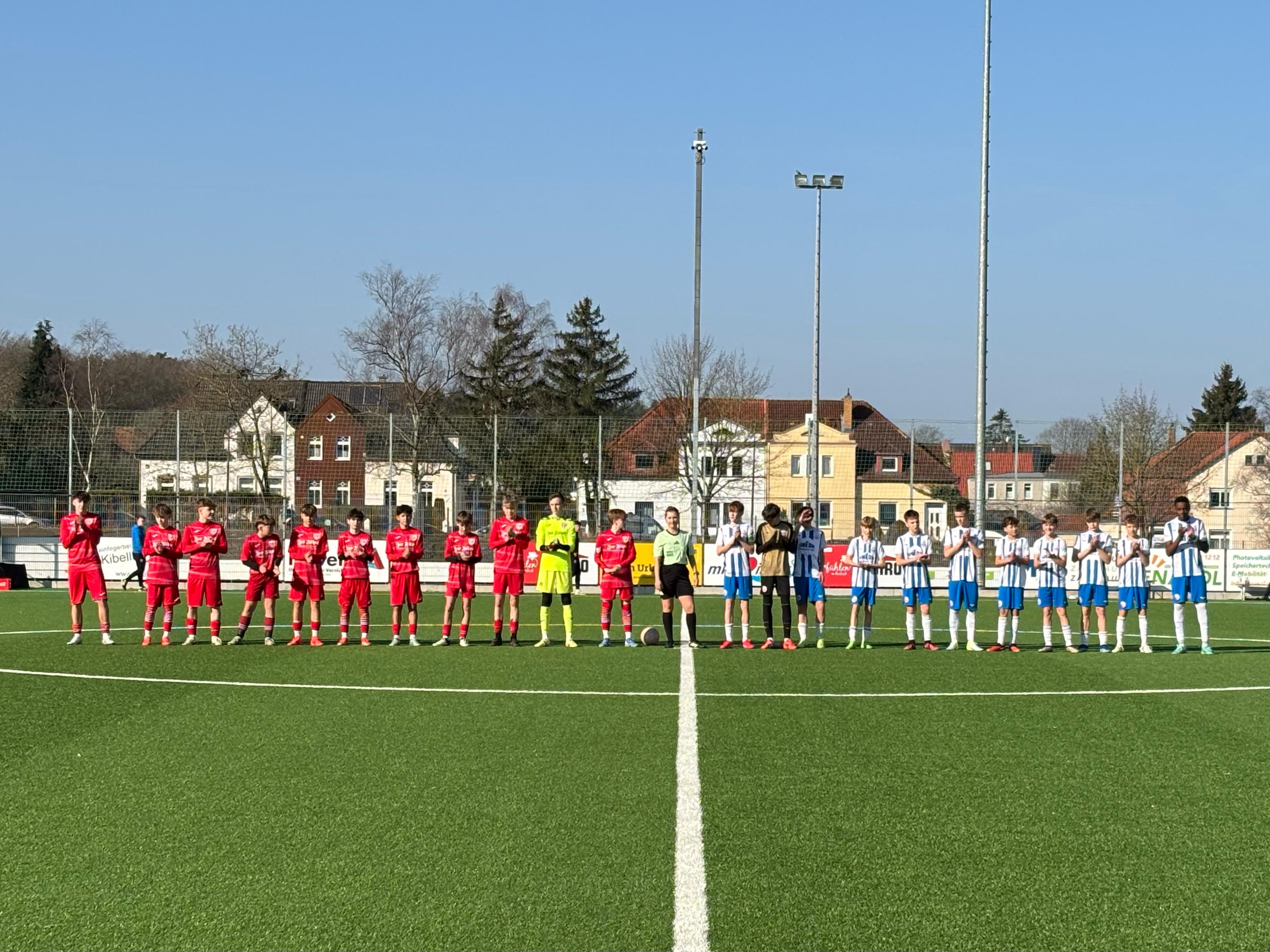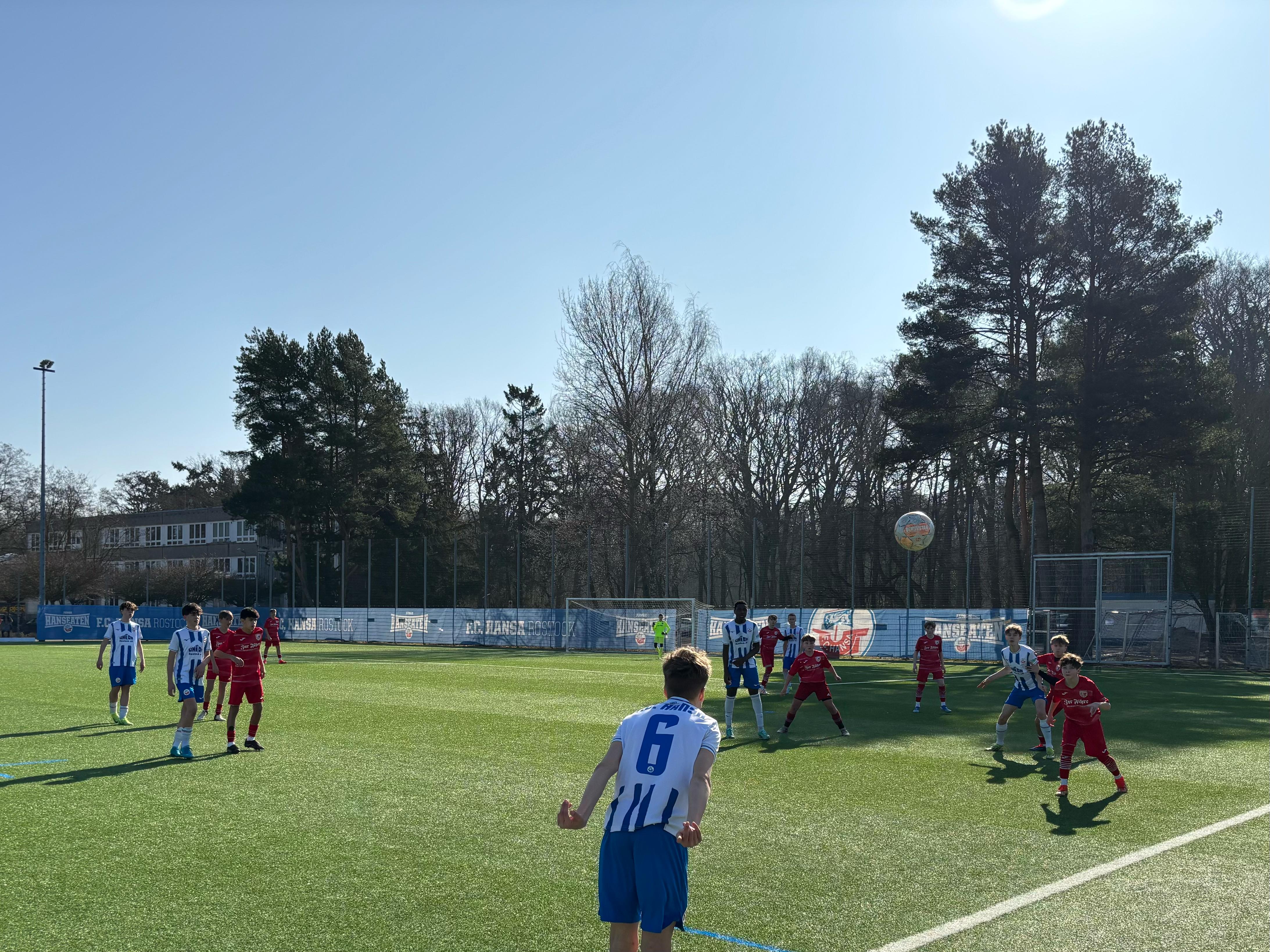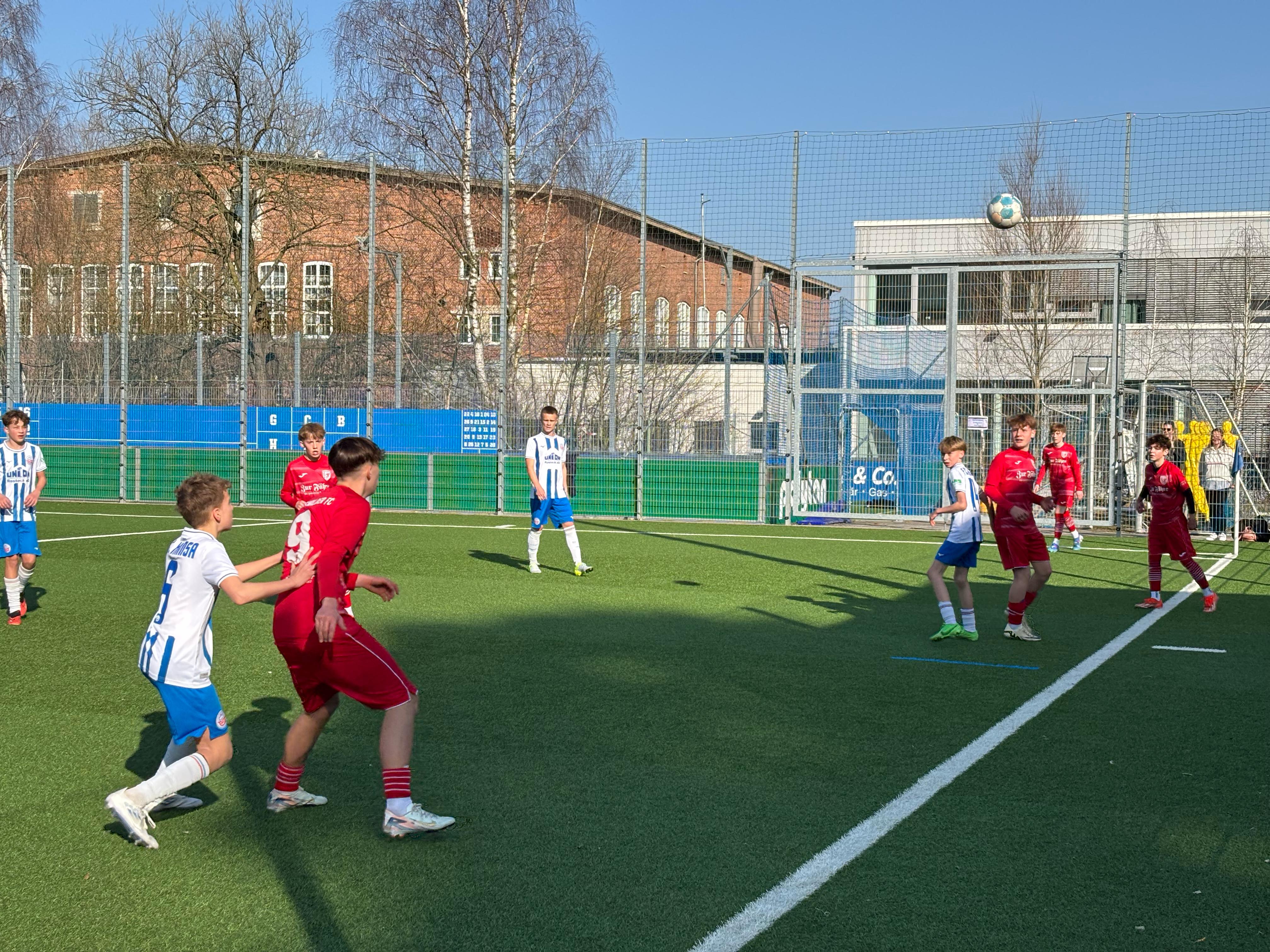 Am Samstag war unsere U14 zu Gast bei der gleichaltrigen Jugend des FC Hansa Rostock. Unsere Jungs kamen sehr gut ins Spiel und erkannten ab der ersten Minute die freien Räume, die uns Hansa gerade in den Anfangsminuten ließ. Bereits in der 7. Minute nutzten wir eben diese in einem schnellen Vorstoß. Mit einer schnell-präzisen Passstafette kombinierten wir uns durch die Abwehr der Kogge und konnten frei vorm Tor am Keeper vorbei einschieben. Hansa am Boden, wir oben auf! 30 harte Minuten folgten auf diese schnelle Führung für unsere U14. Hansa drückte nun ununterbrochen, wir hielten aber stets dagegen, zeichneten uns mit Biss und Kampf um jeden Zentimeter aus! Hansa wurde zunehmend ungeduldiger und ruppiger! Wir retteten jedoch die Führung in die Pause, was ein Kraftakt in Halbzeit eins. Trainer John-Philipp Bruhns, bis hierhin äußerst zufrieden, schwor die Jungs auf eine noch härtere und kräftezehrende 2. Halbzeit ein. Und so kam es auch, Hansa weiter sehr körperlich, stellenweise auch überzogen. Etliche harte Zweikämpfe gipfelten leider in einem üblen Foul an unserem Innenverteidiger Titus. Er stürzte nach einem unnötigen Schubser in den Rücken unglücklich und verletzte sich schwer an der Schulter, Schlüsselbeinbruch! Ein herber Verlust, den es zu kompensieren galt! Hansa weiter mit Druck, nutzte die Umstellung in unserer Abwehr und konnte in Minute 45 per Weitschuss von links ins lange Eck sehr sehenswert ausgleichen.