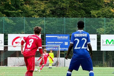 Unsere andere C-Jugend, die U14, war im Landespokal gefordert. Dort traf das Team von Christian Koch und Marc Lubbe auf den Rostocker FC. Es war das Duell zweier Tabellenführer der Landesliga, das Ergebnis sollte jedoch ein deutliches werden. Nach einer engen Anfangsphase brachte eine Ecke die Gäste in Führung. Kurz vor der Pause erhöhten sie dann sogar noch auf 0:2, nachdem unsere U14 die zahlreichen Torgelegenheiten nicht in Zählbares umwandeln konnte. Auch in der zweiten Halbzeit hatten unsere Jungs weiter einige gute Gelegenheiten, der RFC lauerte in dieser Phase auf Konter. Nach dem schnellen dritten Gegentor verkürzte Sascha Husmann auf 1:3. Danach warf das Team nochmal alles nach vorne, wurde aber in den Schlussminuten dafür mit drei schnellen Kontern bestraft. Am Ende stand ein 1:6 auf dem Tacho, das in der Höhe zu deutlich ausfiel. So oder so besiegelte es aber das Landespokalaus für unsere U14.