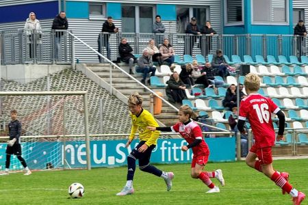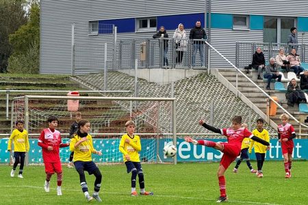 Lange haben wir darauf gewartet, nun ist es endlich passiert. Paul Kriegbaum schickte Oskar Mattick über die linke Seite. Der erlief den Ball kurz vor der Grundlinie, flankte mit links in die Mitte. Am Fünfmeterraum verpasste Lycka Röder, aber Matti Schöfer stand genau richtig. Der nahm den Ball an und schloss flach ins lange Eck ab! Es war der erste Regionalligatreffer unserer U15 und der Jubel war bezeichnet.