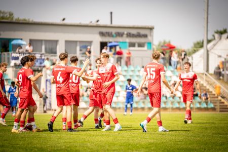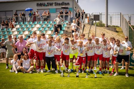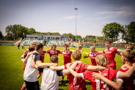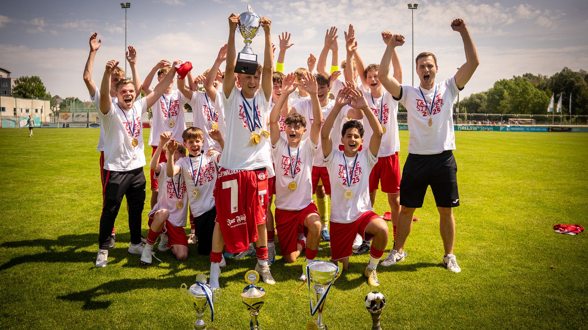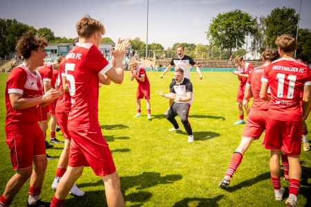 Es war die Krönung einer bisher herausragenden Saison. Unsere U15, angereist mit einer Bilanz von 19 Siegen aus 19 Spielen, dem Landespokal und dem Pokal der Hallenlandesmeisterschaft, wollte in Neubrandenburg auch das letzte Saisonspiel gewinnen und auf dem Platz des einzigen Konkurrenten den nächsten Titel feiern. Eine theoretische Chance war auch noch für den FCN gegeben. Ein Sieg mit vier Toren Unterschied oder mehr, hätte die Jungs aus der Vier-Tore-Stadt noch auf den ersten Rang springen lassen. Nach einem nervösen Beginn auf beiden Seiten war es in der 16. Minute ein langer Freistoß von der Mittellinie, der durch Domenik Jäger zur Führung für unseren GFC vollendet wurde. In der Folge war unser GFC das bessere Team, ließ aber gegen Ende der ersten Halbzeit etwas nach. Ein Sonntagsschuss von Pascal Buschke sorgte kurz vor der Pause für den Ausgleich. „Wir haben die gleiche Ausgangslage wie vor dem Spiel, die brauchen immer noch vier Tore. Das einzige ist, dass wir nun nur noch 35 statt 70 Minuten arbeiten müssen“, sagte Trainer Tom Röhl in der Halbzeitansprache und forderte neben Kampf und Leidenschaft trotzdem den Sieg. Seine Jungs erhörten ihn und nur eine Minute nach Wiederanpfiff war es erneut Domenik Jäger, der nach einer Flanke von Marat Chatschatrjan das 2:1 für uns erzielte. Nach einer Ecke von Ferris Kelm traf nur sieben Minuten später Til Barke per Kopf und erhöhte auf 3:1. Die Messe schien gelesen, was die Meisterschaft anging. Trotzdem sollte die perfekte Saison her. Sieben Minuten vor Ende wurde es dahingehend nochmal spannend, als Neubrandenburg den Anschlusstreffer erzielte. Unsere Jungs aber verteidigten mit allem was sie hatten und nach fünf Minuten Nachspielzeit war der Jubel groß. Mit dem 3:2-Erfolg sicherten sie sich also mit 60 Punkten die völlig verdiente Meisterschaft in der Verbandsliga und spielen nun in der Relegation um den Aufstieg in die Regionalliga. Das Hinspiel findet am kommenden Sonntag in unserem Volksstadion statt, gespielt wird auf dem Hauptplatz!
