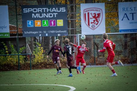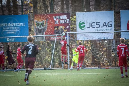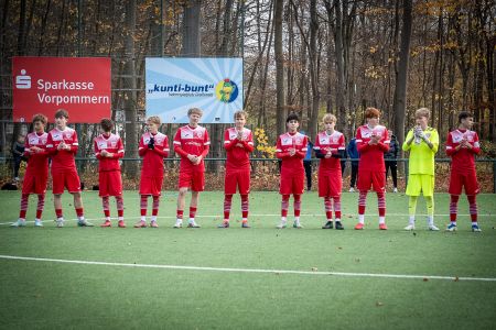 Unsere U11 trat am Sonntag gegen den HFC Greifswald an und wollte nach den Niederlagen gegen Demmin und vor allem dem bitteren Last-Minute-1:2 gegen Stralsund an diesem Wochenende wieder etwas mitnehmen. Der HFC erwies sich allerdings als schwieriger Gegner und so war ein Durchkommen für das Team von Danny Martens kaum möglich. Spielerisch fand das Team nicht zu seiner gewohnten Qualität und zu selten gelang es daher das eigene Passspiel aufzuziehen und sich konstruktiv aus engen Situationen zu lösen. Der HFC ging nach 20 Minuten in Führung, unserem Team gelang jedoch sogar noch vor der Pause der verdiente Ausgleich. Dann sollte sich Geschichte jedoch wiederholen. Wie schon in der Vorwoche sollte es einen Nackenschlag kurz vor Ende geben. Ein Hengste-Spieler fasste sich ein Herz, zog aus der Distanz ab und von der Latte klatschte der Ball an den Rücken unseres Torhüters und von dort ins Tor. Es war der 1:2-Endstand aus unserer Sicht und damit eine erneute Niederlage. Diese wirft das Team aber nicht zurück, schließlich ist die gute Entwicklung weiterhin deutlich sichtbar.