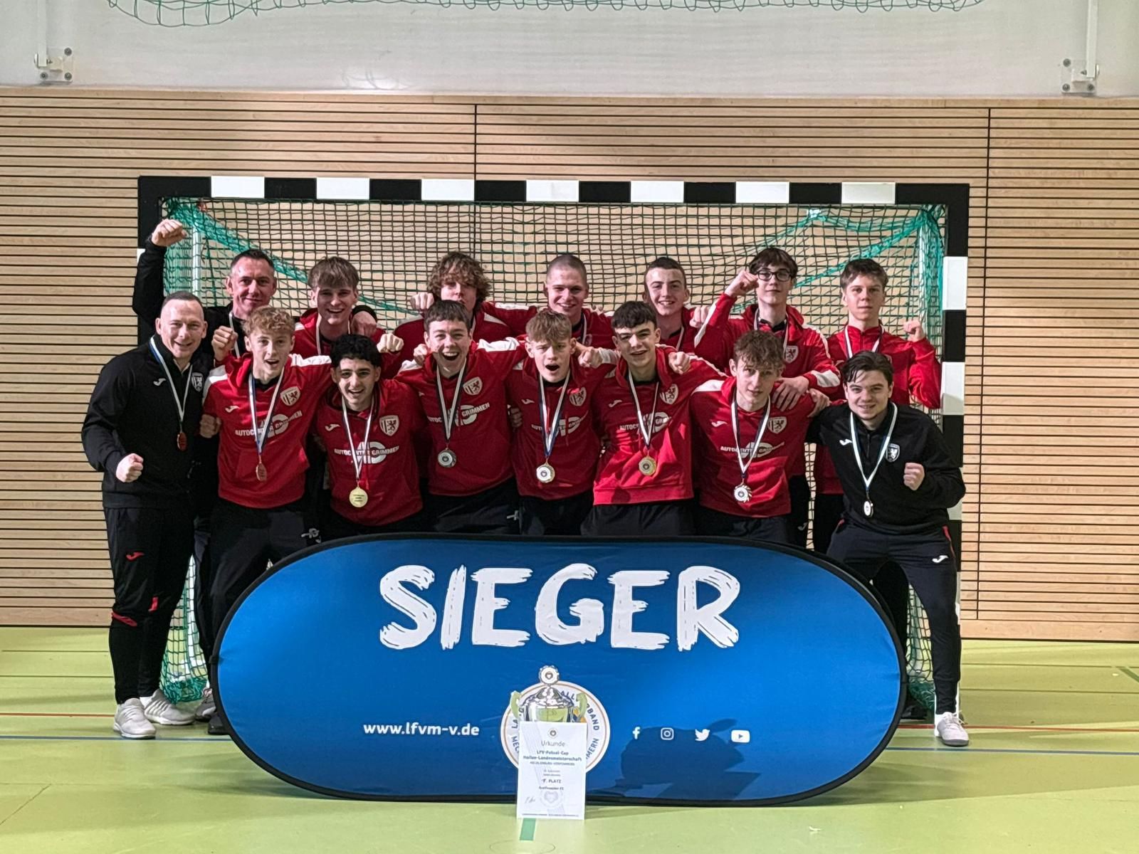 Der Jubel war grenzenlos am vergangenen Sonntag in Greifswald. Unsere U17 trat in der eigenen Stadt zur Hallenlandesmeisterschaft an, hatte sich bereits souverän für die Endrunde qualifiziert und wollte nun natürlich erneut abliefern. Gleich im ersten Spiel ging es dabei gegen den F.C. Hansa Rostock. „Wir sind intensiv in das Spiel gegangen und haben Hansa wenig Zeit und Raum zum Spielen gegeben“, zeigte sich Trainer Marco Kröger stolz. Das konnte er auch sein, denn schön herausgespielte Treffer brachten den klaren 3:0-Sieg. Knapper war es dann schon gegen Mecklenburg Schwerin. Dort sah es lange nach einem Remis aus, da die vielen Möglichkeiten ungenutzt blieben. 50 Sekunden vor dem Ende gab es dann aber doch nochmal die große Gelegenheit und Lenny Mohr erzielte tatsächlich noch den 1:0-Siegtreffer! Nach dem souveränen 3:0 gegen den Förderkader Rene Schneider und einem knappen 2:1 gegen den Lübzer SV war es eigentlich schon klar. Dennoch blieben unsere Jungs konzentriert, fuhren auch gegen den Demminer SV einen klaren 4:0-Sieg ein und gewannen mit fünf Siegen aus fünf Spielen und deutlichem Vorsprung die Hallenlandesmeisterschaft 2026! Nun dürfen sie in zwei Wochen nach Gera, um an der NOFV Meisterschaft teilzunehmen. Für einige der Jungs, die im vergangenen Jahr schon als U15 daran teilnahmen, eine tolle Bestätigung!