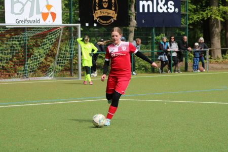 Im Grunde war die Partie mit diesem Ergebnis bereits entschieden, allerdings dürfte im Fernduell mit dem TSV 1860 Stralsund um den zweiten Rang jeder Treffer von Bedeutung sein. Daher wollten die Mädels auch in Halbzeit zwei weiter Vollgas geben. Wie zeigte sich das? Direkt in der ersten Minute der zweiten Hälfte arbeiteten unsere B-Mädels stark nach vorne und holten einen Eckball heraus. Alena Stechert, hierfür wie immer zuständig, glänzte dabei erneut als Vorlagengeberin und schlug die Ecke perfekt in die Mitte. Dort lauerte, wer schon, Lia Bücke und köpfte den Ball unter die Latte. Doch das schien der 17-Jährigen noch immer nicht zu reichen. Noch drei weitere Treffer erzielte Bücke im weiteren Spielverlauf und schraubte mit ihrem achten Treffer des Tages kurz vor Schluss das Ergebnis auf 9:0 hoch. Das war dann letztendlich auch der Endstand dieser einseitigen Partie. Nachdem das Team im vergangenen Jahr noch ordentlich Lehrgeld zahlen musste, steht es nach zehn Saisonspielen als Zweiter nun sehr gut da und hat es jetzt selbst in der Hand. Mit einem Sieg im nächsten Spiel wäre ihnen die Vizemeisterschaft nicht mehr zu nehmen. Am 17. Mai geht es hierfür im heimischen Volksstadion im direkten Duell gegen den TSV 1860 Stralsund. Seid um 12:30 mit dabei und unterstützt unsere Mädels!