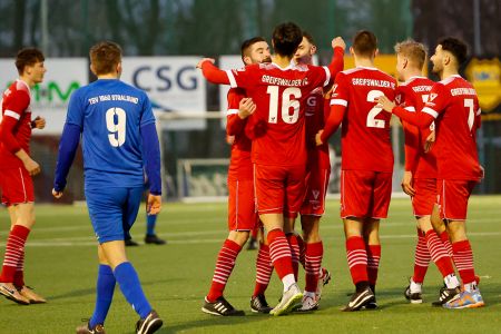 Von Beginn an war ordentlich Druck auf dem Kessel, beide Mannschaften wollten möglichst früh in Führung gehen und dem jeweiligen Gegner keinen Ball gönnen. Nach neun Minuten war es Niclas Gleisner, der nach einem Freistoß von Philipp Sundt mit einem Schuss ins lange Eck zur 1:0 Führung traf. Postwendend, der Jubel war noch nicht ganz verklungen, traf der Stralsunder Rekordtorschütze der Vorsaison Jacob Philippen zum Ausgleich. Nach diesem Dämpfer entwickelte sich ein zäheres Spiel. Unsere Roten ließen sich vom Ausgleich doch mehr beeindrucken als gewollt und rannten dem Ball viel hinterher, ohne selbst gefährlich werden zu können.