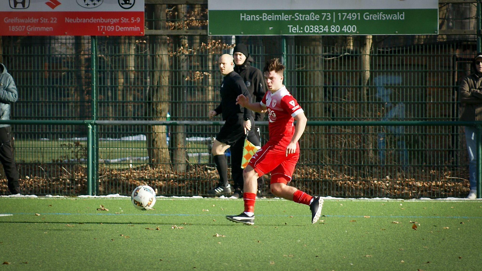 Vor rund 50 Zuschauern entwickelte sich auf dem Kunstrasen eine dynamische Begegnung, in der unsere Männer die ersten zehn Minuten ziemlich verschliefen. Die Schönberger tauchten zu Beginn öfter vor dem Kasten von Carl Claas auf, ohne jedoch Zählbares mitzunehmen. Für die erstmals zusammen agierende Abwehrkette bestehend aus Shostatskyi, Settgast, Schiller und Klaeske war die Anfangsphase ein Kraftakt. Im Laufe der ersten Hälfte kamen unsere Roten immer besser ins Spiel. Einige mehr oder weniger klare Chancen konnten allerdings nicht verwertet werden. Nach einer halben Stunde zeigte Referee Rico Zander auf den Punkt - leider auf der falschen Seite. Vorausgegangen war ein versehentliches Handspiel von Markus Klaeske. Schönberg verwandelte zum 1:0. Eine bittere Pille für die U23, waren sie doch mittlerweile besser im Spiel.