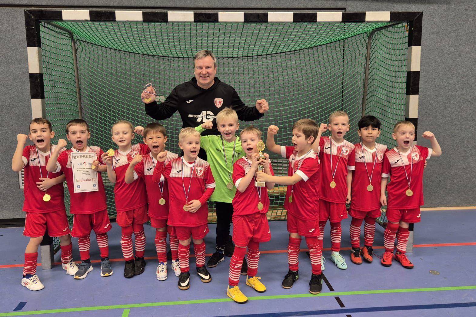 Am Wochenende ging es für unseren Nachwuchs in der Halle natürlich weiter. Für unseren U7-Trainer Torsten Ziesemer war es die Möglichkeit einen Titelhattrick zu holen. Bereits in den vergangenen beiden Jahre konnte er mit seiner G-Jugend die Hallenkreismeisterschaft gewinnen. Auch an diesem Wochenende wollte er natürlich gerne wieder erfolgreich sein und seine Greifenkids sollten abliefern. In der Gruppe gelangen dem Team vier Siege ohne Gegentor. Eintracht Zinnowitz (5:0), Blau-Weiß Greifswald (4:0), Sturmvogel Lubmin (3:0) und die SG Karlsburg/Züssow (9:0) konnten unseren GFC nicht stoppen. So qualifizierte sich das Team für das Halbfinale und bekam es mit dem FC Landhagen zu tun. Dort sollten auch erstmals Gegentore kassiert werden, deutlich wurde es allerdings trotzdem. Ein klares 8:2 stand am Ende zu Buche und so zog die Mannschaft ins Endspiel ein.