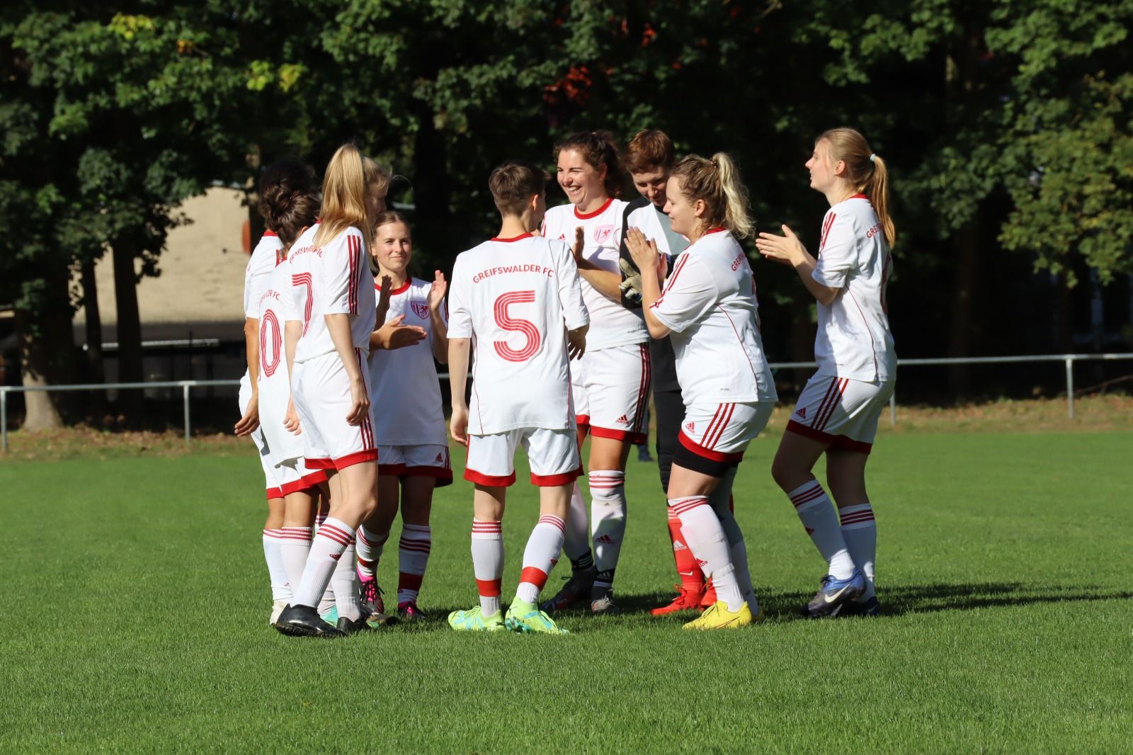 Und vorne belohnten sie sich. Wie schon im vergangenen Jahr war es Eva Hoppe, die unseren ersten Treffer erzielen konnte. Die zeigte sich gewohnt bärenstark und verteilte die Bälle, wie nur sie es kann. Auch die zurückgekehrte Pia Wiechmann präsentierte sich, als wäre sie nie weg gewesen und selbstverständlich war auch unsere Paula Falk wieder in Top-Form. Noch vor der Pause erzielte „Falki“ das 2:0 und sorgte damit für noch mehr Sicherheit. „Hinten hatten wir zudem auch noch den nötigen Dusel. Ein Freistoß von Penzlin ging an das Lattenkreuz, dazu hatten sie einen weiteren Treffer an die Latte, Louis stand nach einer Ecke mal goldrichtig“, so Bartl weiter. Einen Gegentreffer ließ das Team zwar doch zu, auf der Gegenseite hatten wir aber immer wieder Antworten parat. Paula Falk machte noch zwei weitere Treffer um ihren ersten Verbandsligahattrick perfekt zu machen. Die Führung gab dem Team dann natürlich nochmal endgültig einen Selbstvertrauensschub, sodass die Mädels überhaupt keine Zweifel mehr am Ausgang der Partie aufkommen ließ. Ganz im Gegenteil. Die Mannschaft erspielte sich noch so viele Möglichkeiten, dass das Spiel noch höher hätte ausgehen können. Trotzdem ging Penzlin zu keinem Zeitpunkt unter, spielte weiter munter mit. Den Schlusspunkt der Partie setzte passenderweise noch einmal Eva Hoppe mit dem 5:1-Endstand kurz vor Abpfiff. Für Eva war es das letzte Spiel bei unserem Greifswalder FC. Sie wird den Verein aus privaten, aber maximalst positiven Gründen verlassen. Wir danken Eva für alles, was sie für unsere Mannschaft geleistet hat und wünschen ihr und ihrer Familie alles erdenklich Gute. Den perfekten Abschied hat sie sich auf jeden Fall selbst beschert!