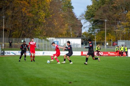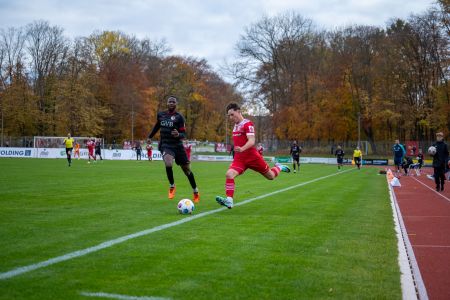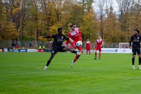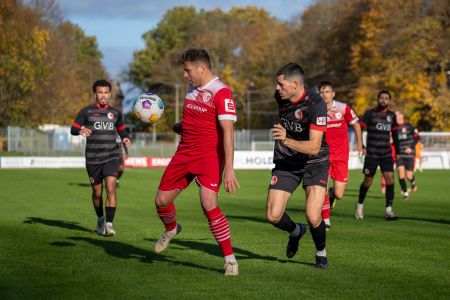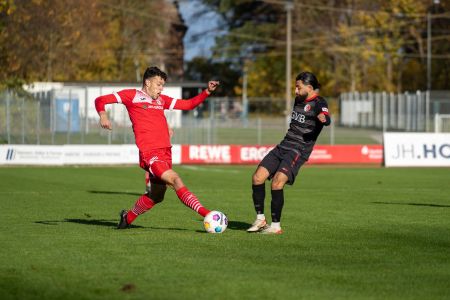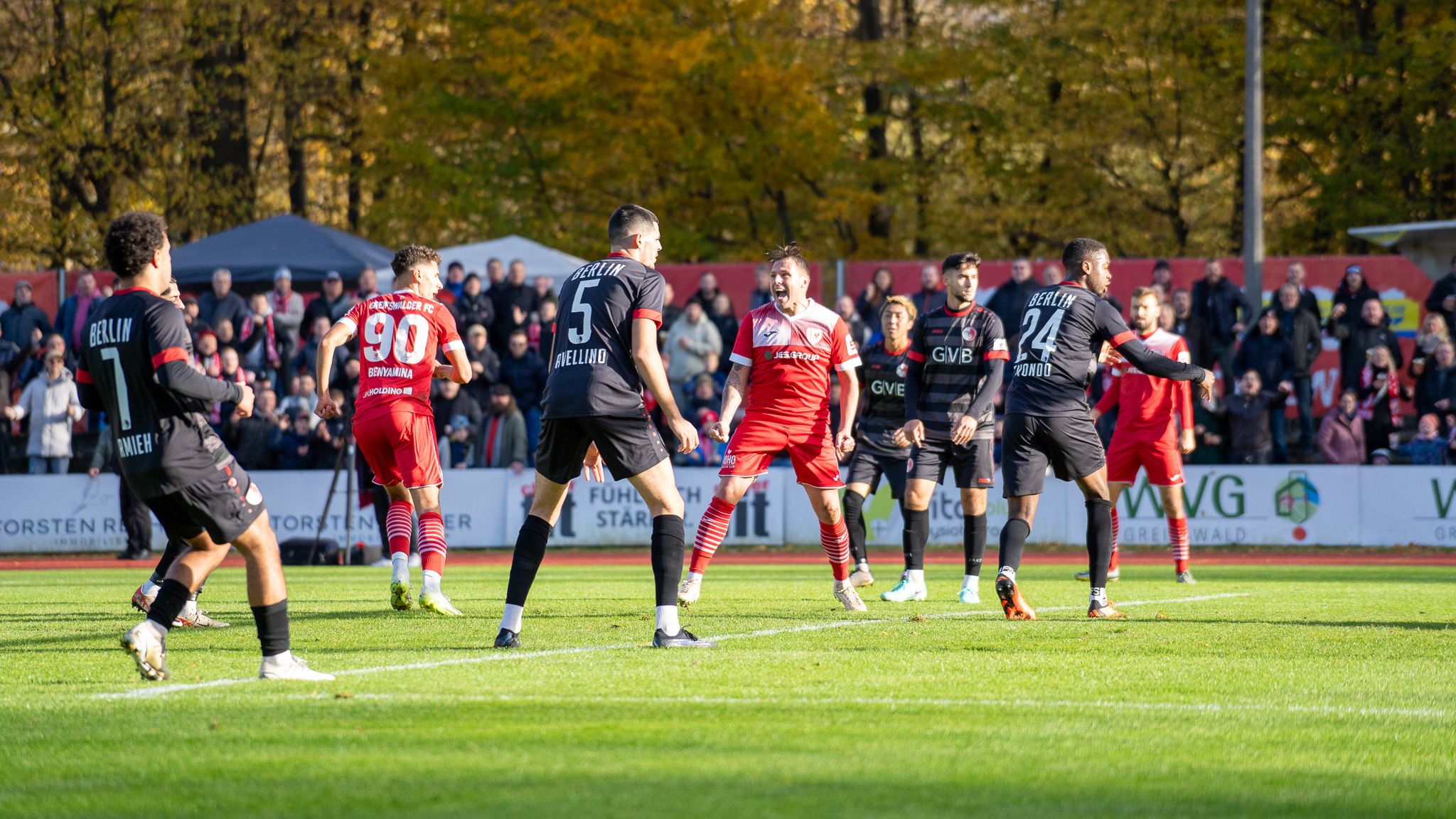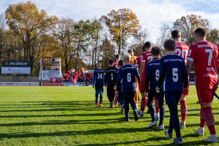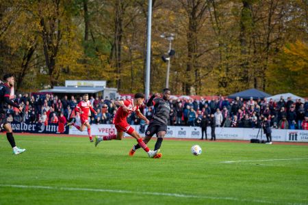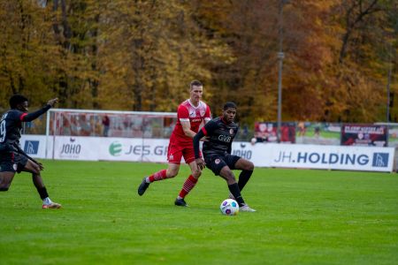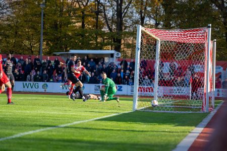 Es war wieder Heimspiel! Auf gleich vier Positionen tauschte Trainer Lars Fuchs in der Startelf. Kapitän Tom Weilandt und Mike Eglseder rückten wieder in die Startelf, ersetzten Daedlow und Adewole. Für den gelb gesperrten Elias Kratzer startete Jannis Farr und Guido Kocer gab sein Startelfdebüt in dieser Regionalligasaison für Manassé Eshele. Und Guido sollte auch derjenige sein, der dem Spiel mal wieder seinen Stempel aufdrückte. Nachdem die ersten zehn Minuten bereits ein paar gute Ansätze bei unserem Team zu erkennen waren, war es unsere Nummer sieben, der für den sogenannten Dosenöffner sorgte. Er schickte zunächst Can Coskun auf der linken Seite, der wurde dann aber weggecheckt. Guido hatte jedoch nicht abgeschaltet, war mit gestartet, schnappte sich den Ball und versenkte ihn ins lange Eck zum 1:0. Ein sehr wichtiger Treffer und ein emotionaler für unseren Routinier. Und dieses Tor nahm auch einiges an Ballast von den Schultern unserer Jungs. Nach vier Unentschieden aus den vorangegangenen fünf Ligaspielen und vielen vergebenen Möglichkeiten war dieser Treffer natürlich Balsam für die Seele und sorgte dafür, dass unser GFC anschließend erst so richtig loslegte. Tom Weilandt war der nächste, der sich gerne in die Torschützenliste eingetragen hätte, doch sein Weitschuss nach einem abgeblockten Ball flog nur minimal über die Latte und landete auf dem Tornetz. Doch unser Kapitän gab damit die Richtung vor. Unser Team wollte das Spiel früh entscheiden.