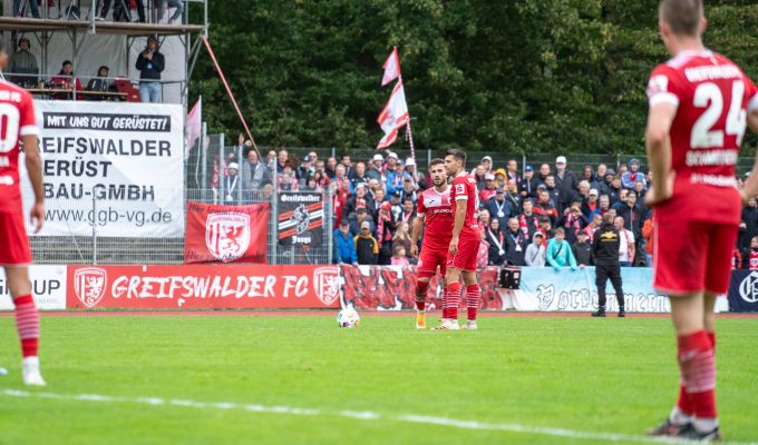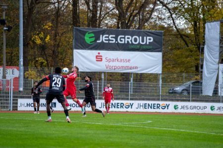 Wenn es um Tore geht, dann wenden wir uns natürlich gerne an einen ganz bestimmten Spieler. Unser Top-Torjäger Soufian Benyamina war auch schon im letzten Heimspiel gegen Cottbus mit seinem späten Treffer der Matchwinner. Gegen den Berliner AK war er nach 24 Minuten erneut zur Stelle und köpfte den Ball sehr platziert zum 2:0 ein. Und nur fünf Minuten später war es wieder „Soufi“, der nach einer Gelegenheit von der linken Seite über Can Coskun in der Mitte genau richtig stand und den Ball als Abstauber über die Linie drückte. Als alle dann schon gedanklich in der Kabine zu sein schienen, war einer noch hellwach. Guido Kocer eroberte nochmal den Ball, ging an Gästekeeper Zwick vorbei und schob zum 4:0-Halbzeitstand ein. Es war, erneut eine Parallele zum Cottbus-Spiel, eine dominante und überragende erste Hälfte unserer Jungs, doch dieses Mal nutzten sie auch ihre Gelegenheiten. Nach Wiederanpfiff wurde es dann etwas ruhiger. Die Berliner standen etwas sicherer, hatten in der Pause doppelt gewechselt. In der Offensive wurde der BAK allerdings nur durch Fernschüsse gefährlich, die Jakubov im Tor aber allesamt sicher entschärfte. Nach knapp einer Stunde durfte sich Doppeltorschütze Guido Kocer feiern lassen und verließ den Platz für Wilmer Cabrera. Der Kolumbianer sollte dann kurz vor Ende auch nochmal Grund zum Jubeln haben. Er schloss einen Konter ab, indem er Zwick tunnelte. Déjà-Vu für den Torwart, der auch beim letzten Gastspiel der Berliner in Greifswald zum Endstand getunnelt wurde. Auch hier sollte kein weiterer Treffer mehr fallen, weil ein Kopfball von Schmedemann knapp neben den Pfosten sprang. Das war aber nicht weiter schlimm, denn dank der Schützenhilfe und natürlich auch dem deutlichen Erfolg sprang unser Greifswalder FC wieder an die Tabellenspitze der Regionalliga Nordost. Dort werden wir nun für mindestens zwei Wochen stehen, denn nächstes Wochenende ist erst mal Landespokal in Warnemünde!